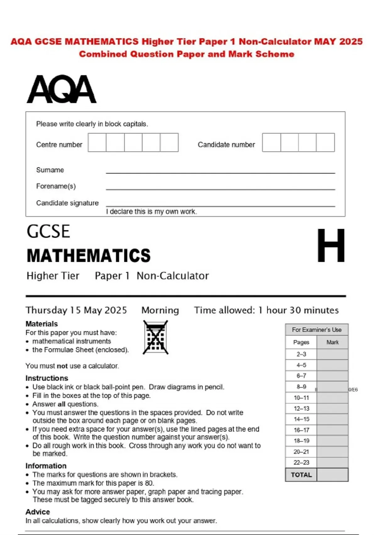 AQA GCSE MATHEMATICS Higher Tier Paper 1 Non-Calculator MAY 2025 Combined Question Paper and Mark Scheme