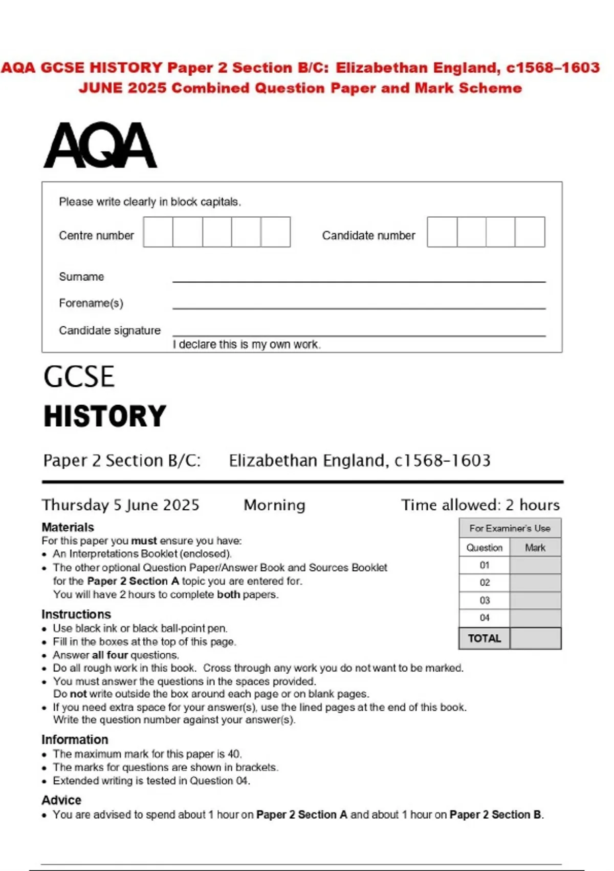 AQA GCSE HISTORY Paper 2 Section B/C: Elizabethan England, c1568–1603 JUNE 2025 Combined Question Paper and Mark Scheme