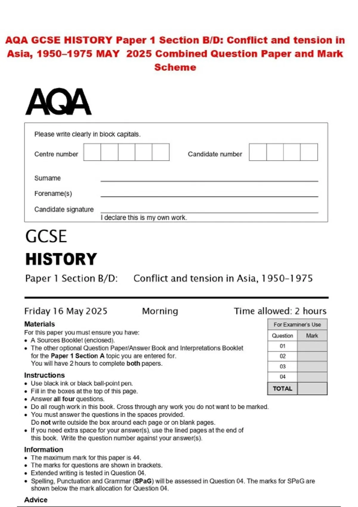 AQA GCSE HISTORY Paper 1 Section B/D: Conflict and tension in Asia, 1950–1975 MAY 2025 Combined Question Paper and Mark Scheme