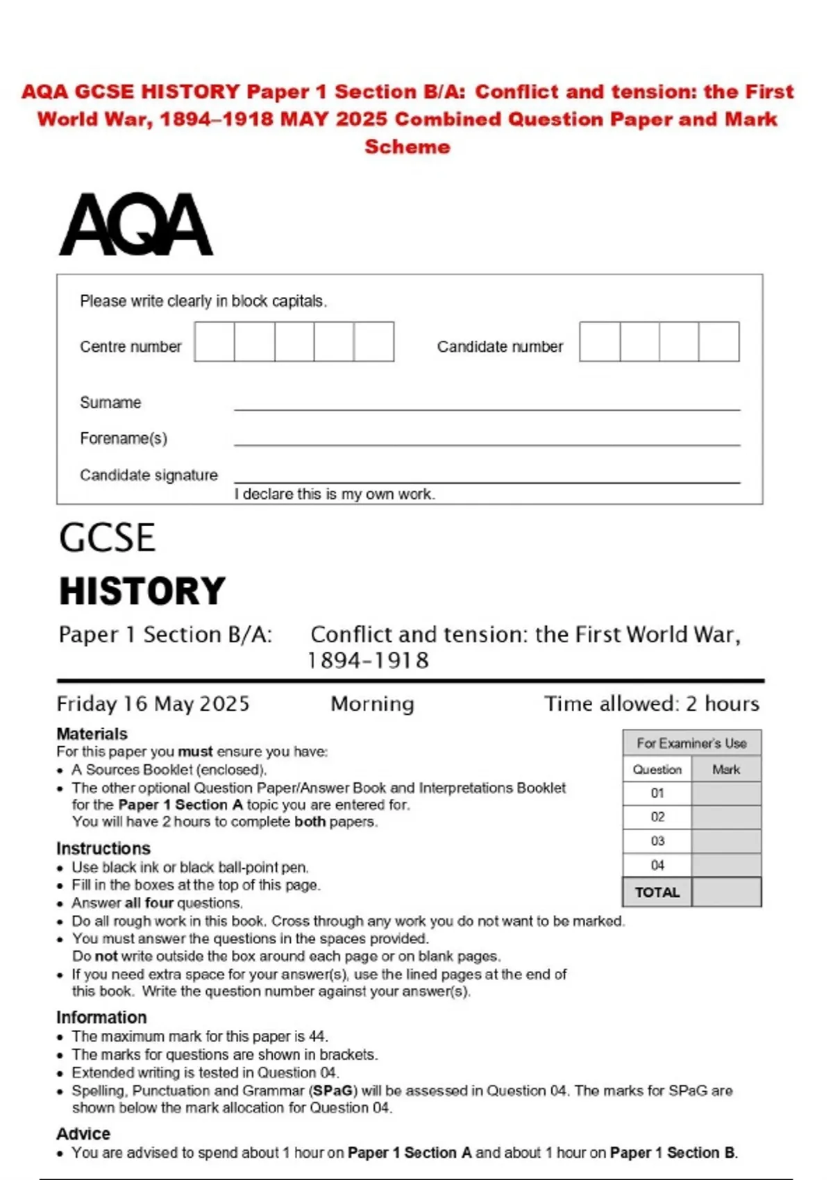 AQA GCSE HISTORY Paper 1 Section B/A: Conflict and tension: the First World War, 1894–1918 MAY 2025 Combined Question Paper and Mark Scheme