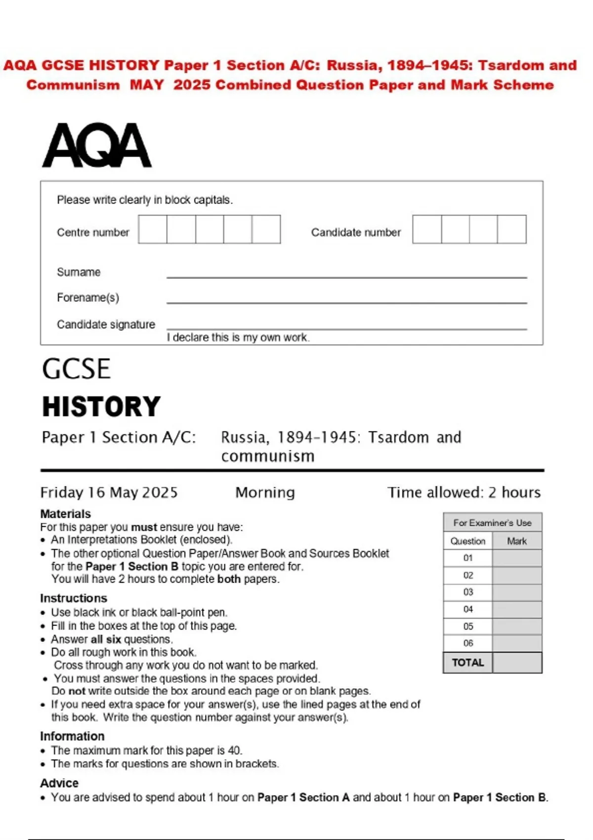 AQA GCSE HISTORY Paper 1 Section A/C: Russia, 1894–1945: Tsardom and Communism MAY 2025 Combined Question Paper and Mark Scheme