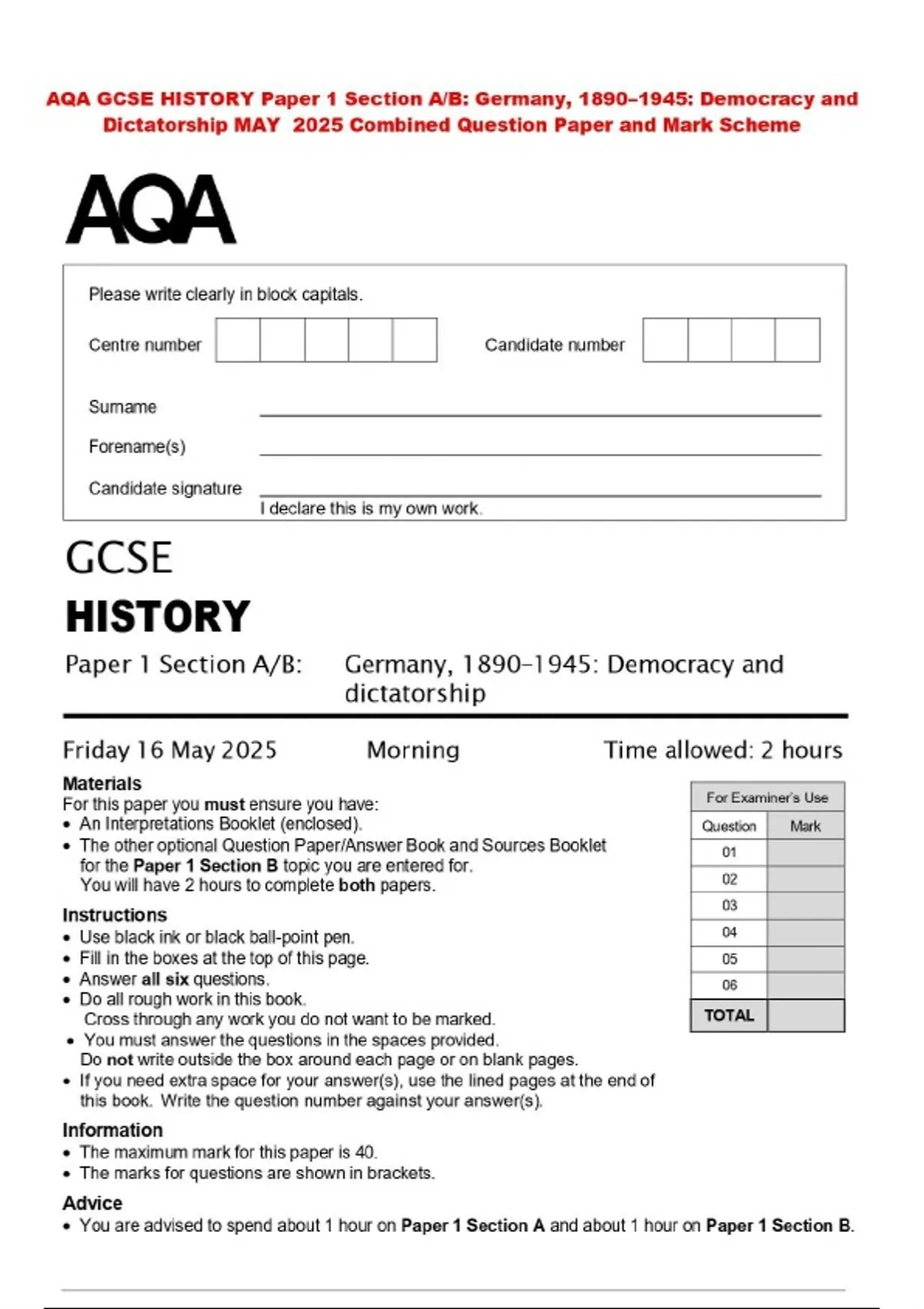 AQA GCSE HISTORY Paper 1 Section A/B: Germany, 1890–1945: Democracy and Dictatorship MAY 2025 Combined Question Paper and Mark Scheme