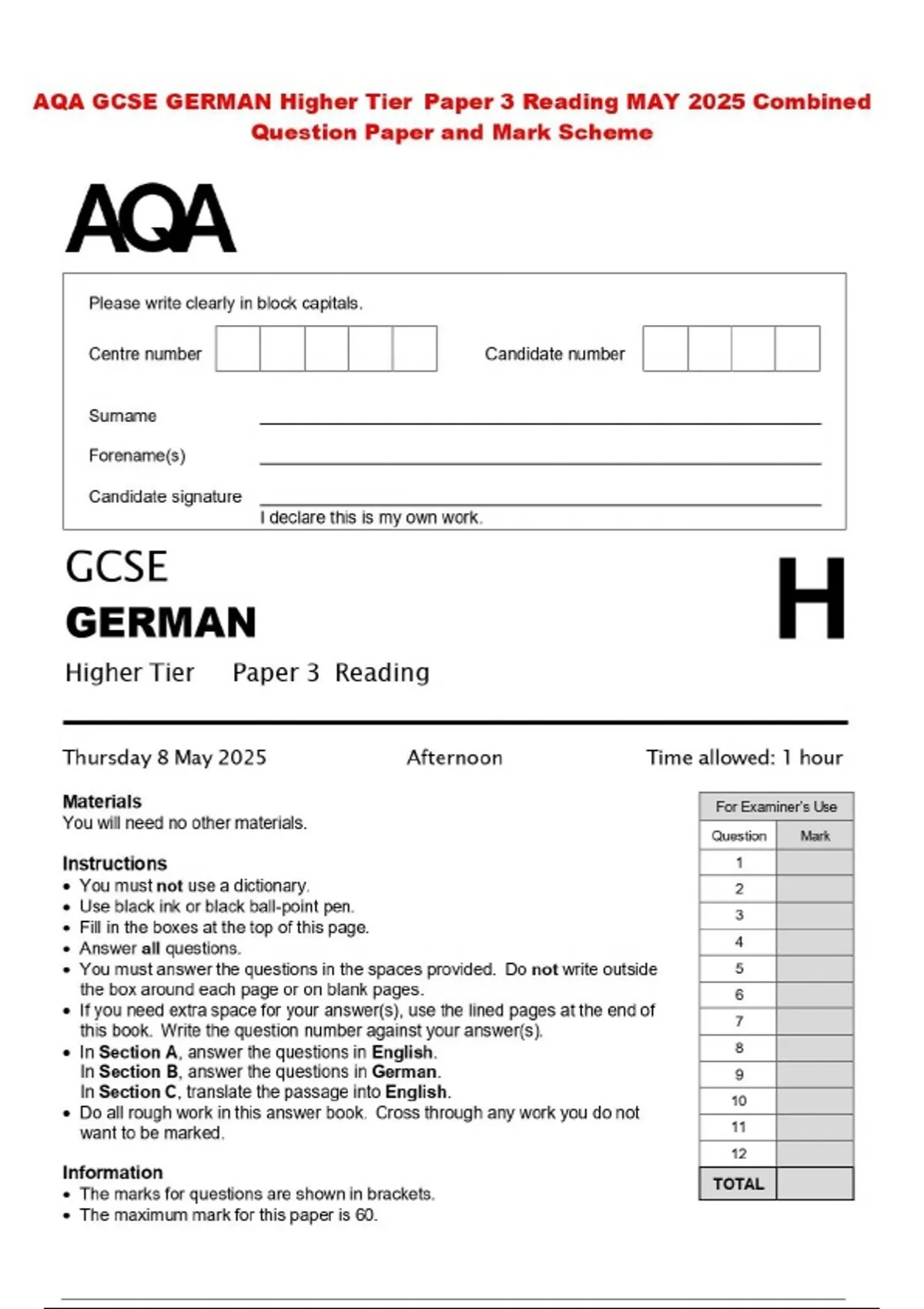 AQA GCSE GERMAN Higher Tier Paper 3 Reading MAY 2025 Combined Question Paper and Mark Scheme