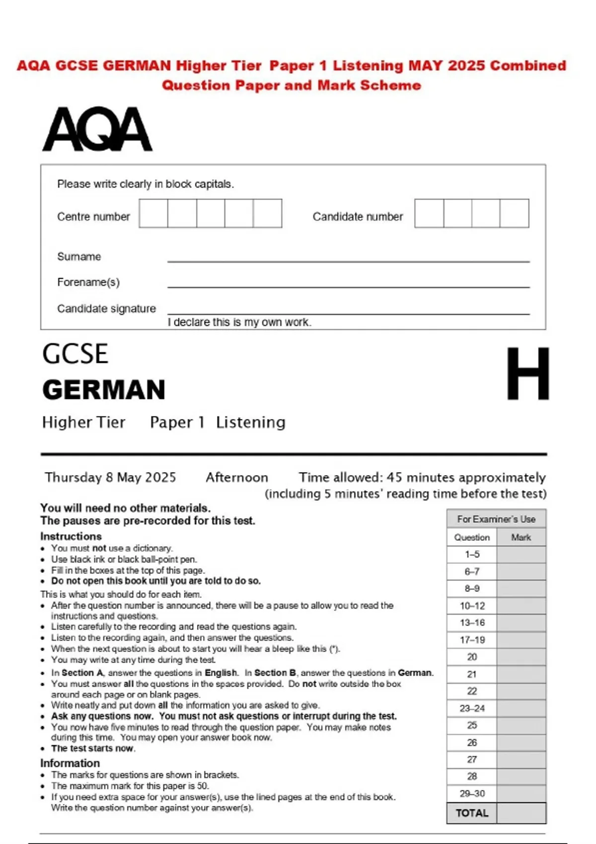 AQA GCSE GERMAN Higher Tier Paper 1 Listening MAY 2025 Combined Question Paper and Mark Scheme
