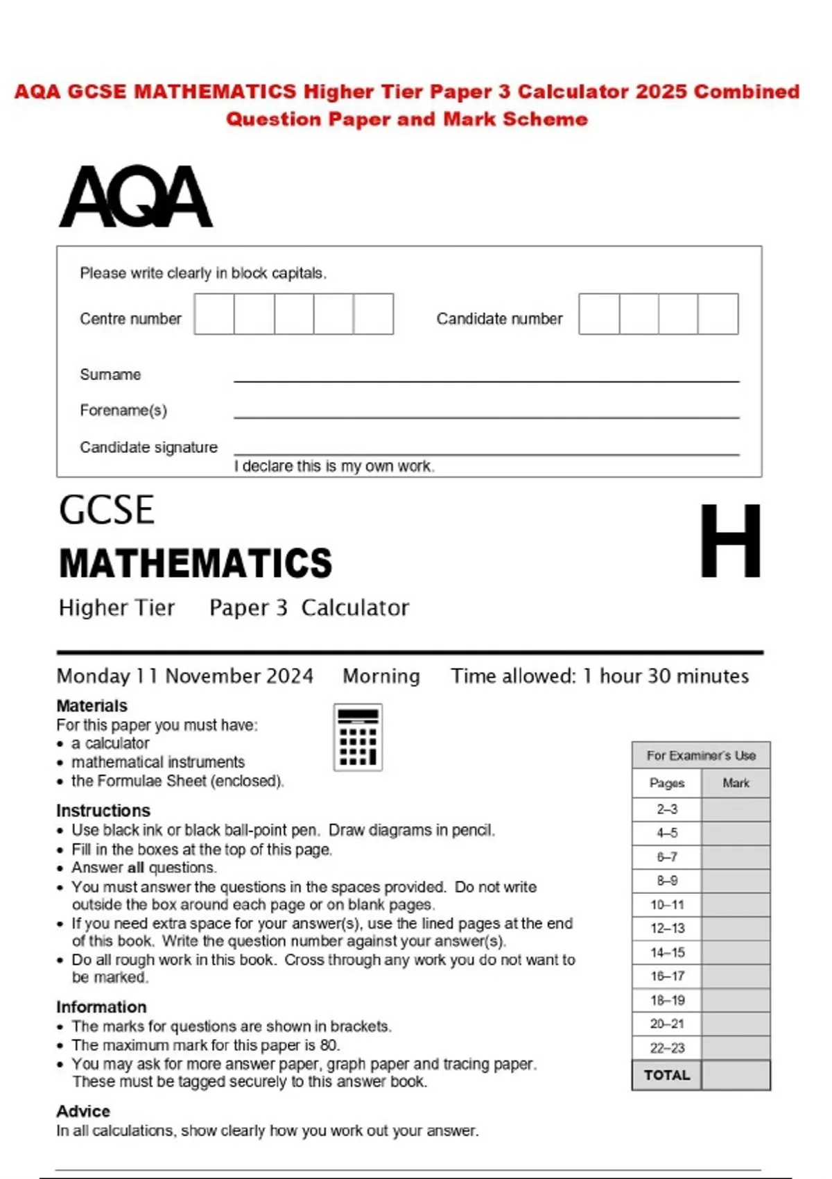 AQA GCSE MATHEMATICS Higher Tier Paper 3 Calculator 2025 Combined Question Paper and Mark Scheme