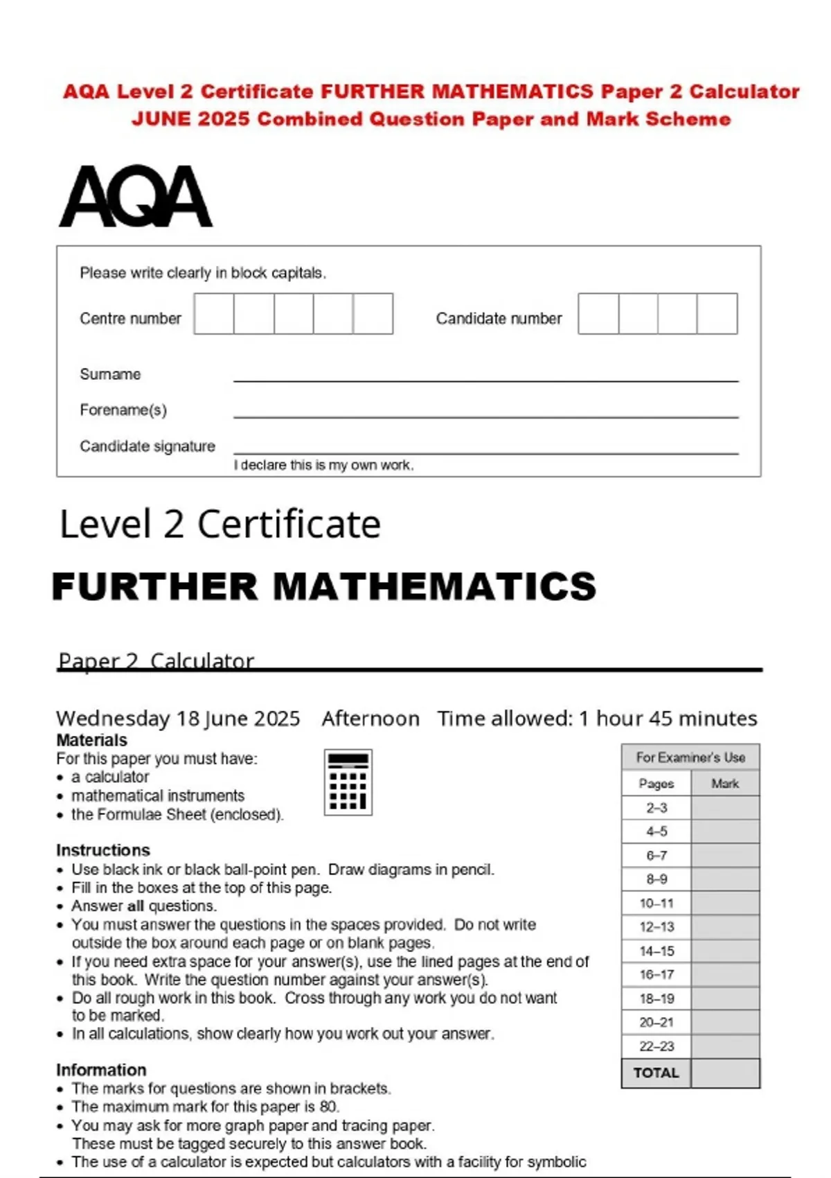 AQA Level 2 Certificate FURTHER MATHEMATICS Paper 2 Calculator JUNE 2025 Combined Question Paper and Mark Scheme