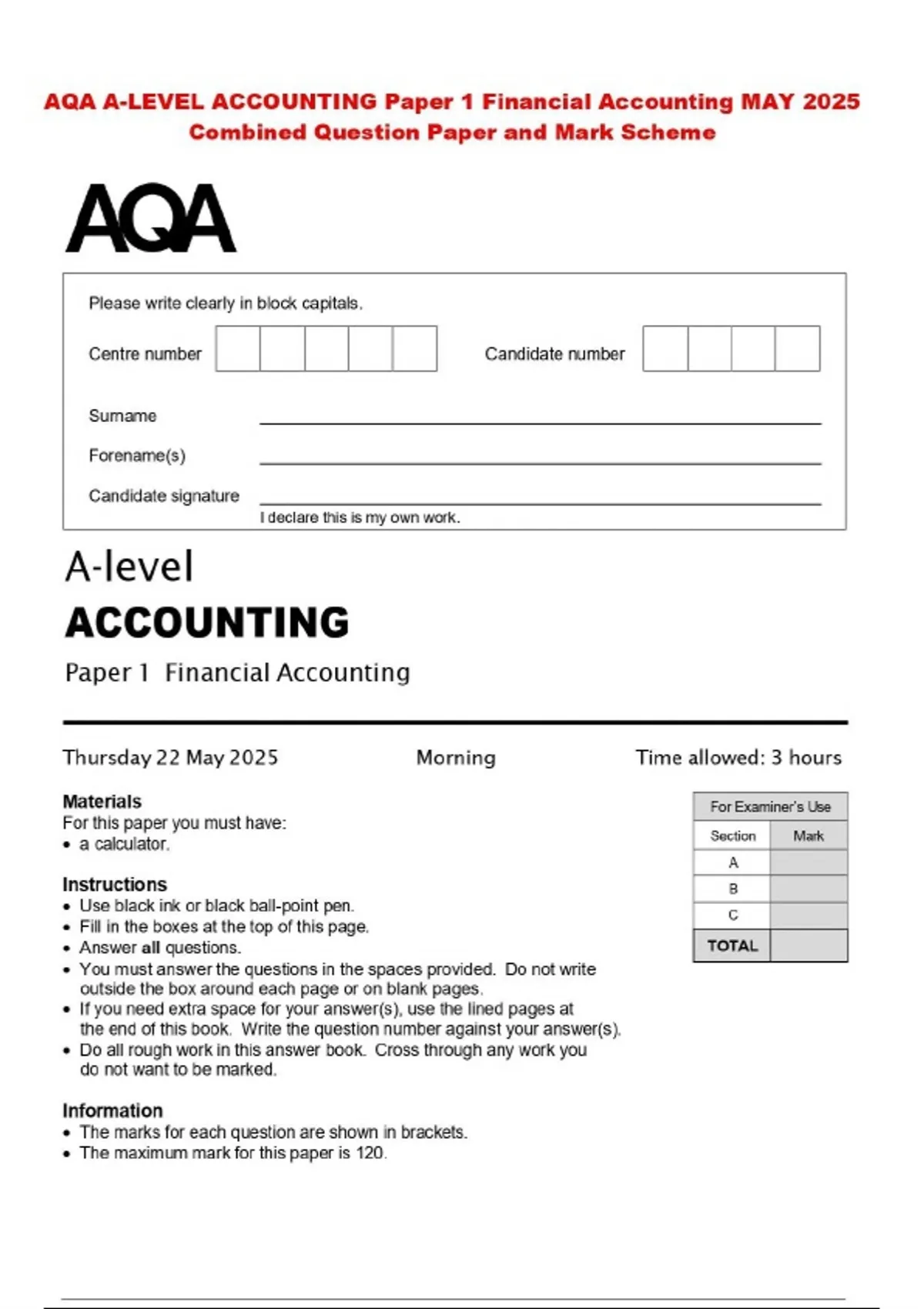 AQA A-LEVEL ACCOUNTING Paper 1 Financial Accounting MAY 2025 Combined Question Paper and Mark Scheme