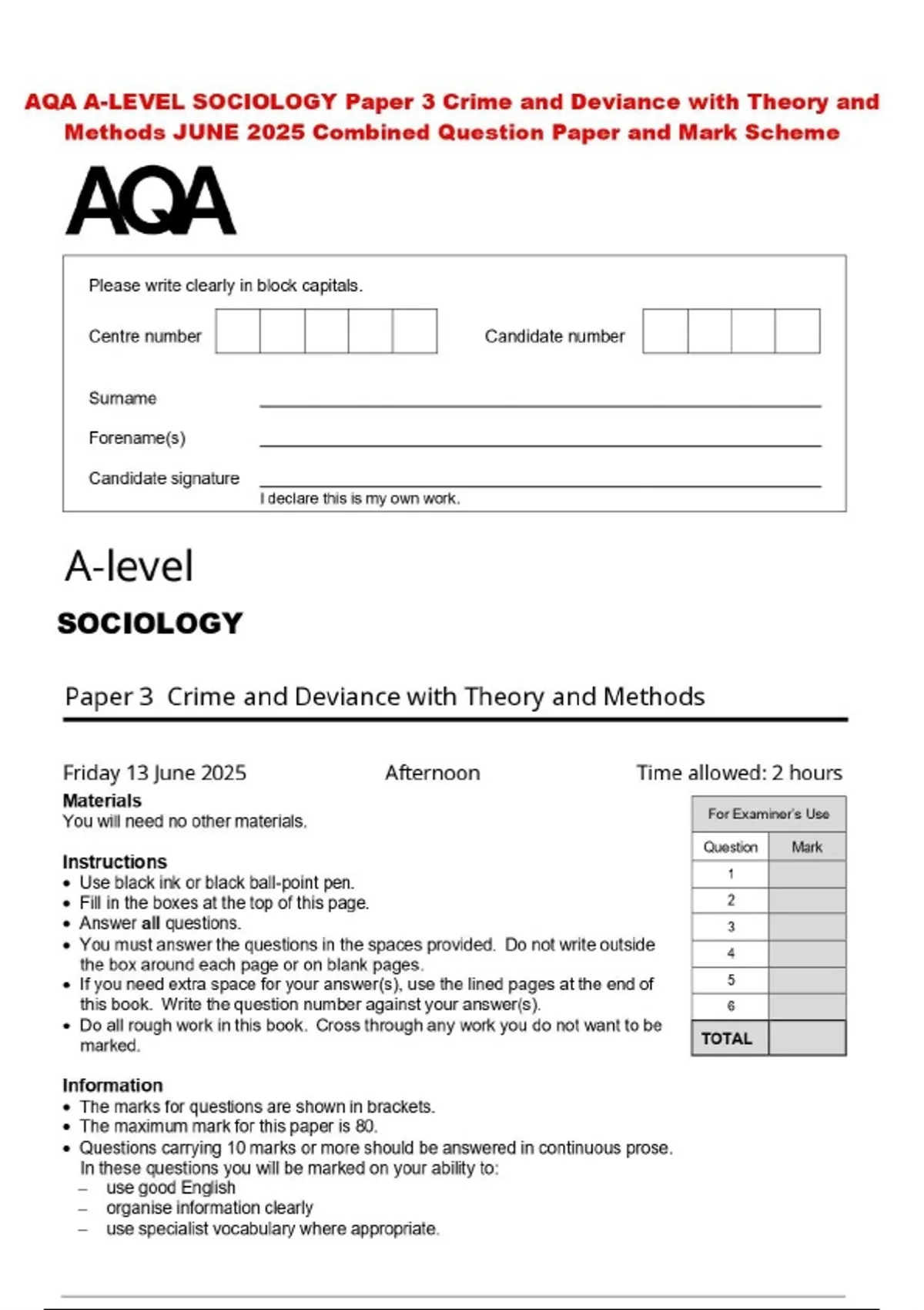 AQA A-LEVEL SOCIOLOGY Paper 3 Crime and Deviance with Theory and Methods JUNE 2025 Combined Question Paper and Mark Scheme