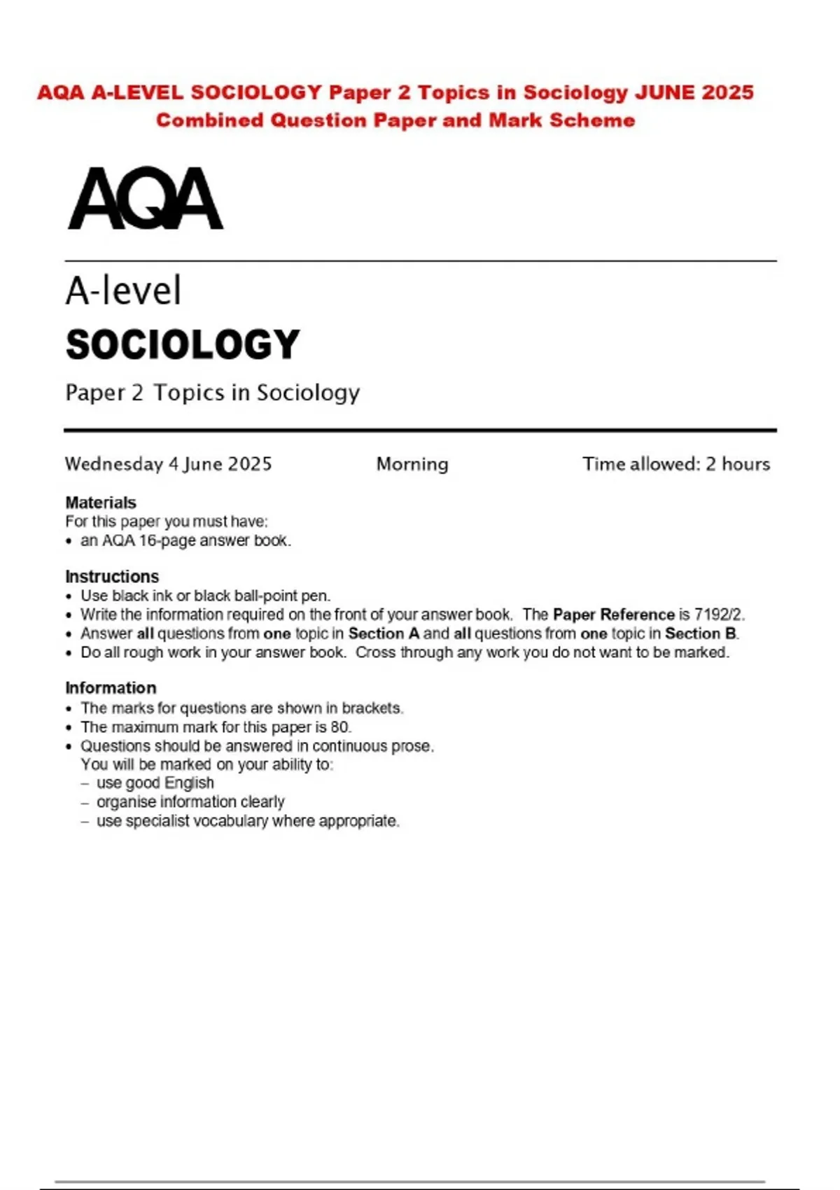 AQA A-LEVEL SOCIOLOGY Paper 2 Topics in Sociology JUNE 2025 Combined Question Paper and Mark Scheme
