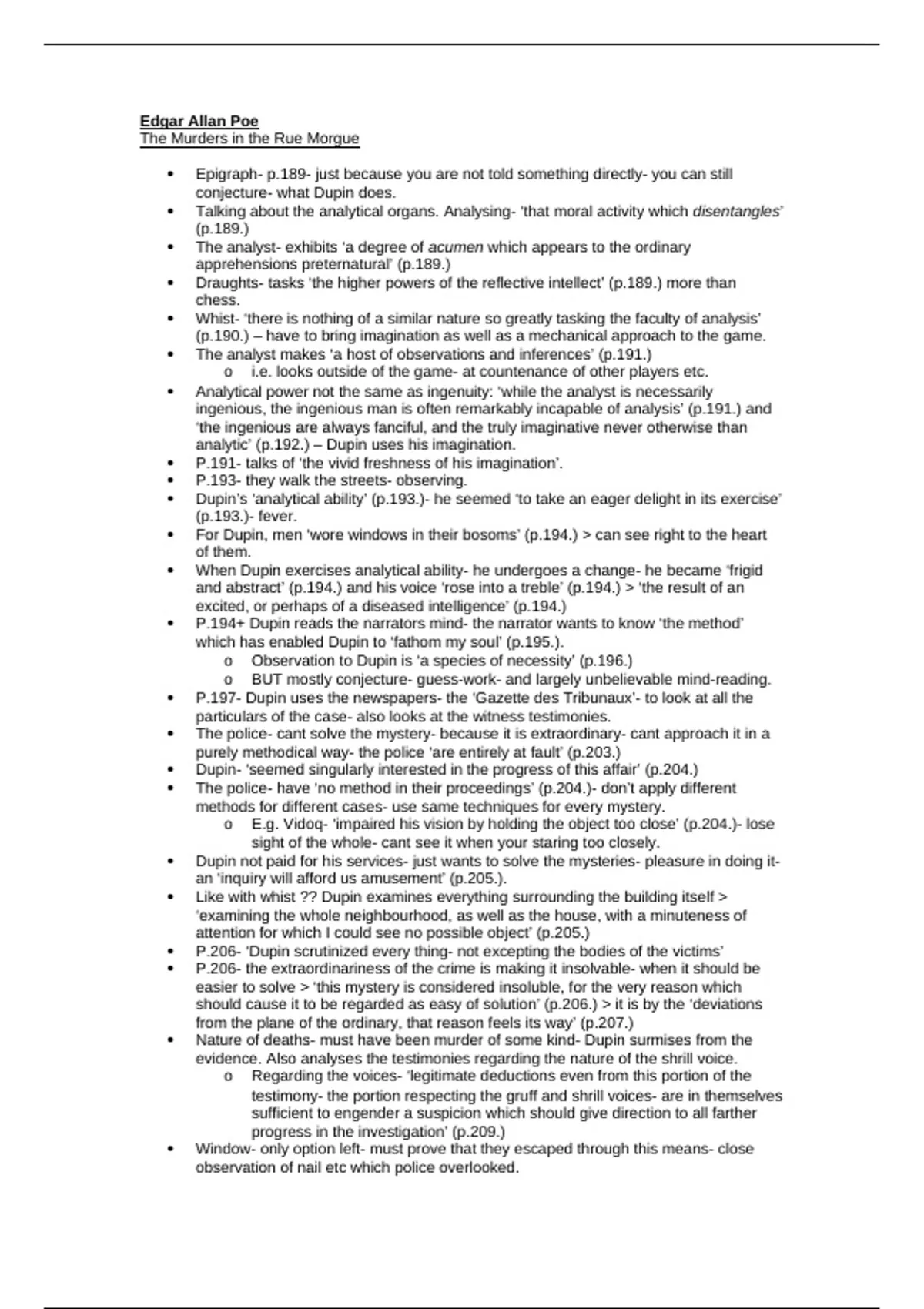 Notes on Edgar Allan Poe's novel The Murders in the Rue Morgue. Explores the character Dupin and how he is superior in his methods compared to the hapless police. Details how Dupin enjoys the game of solving mysteries.