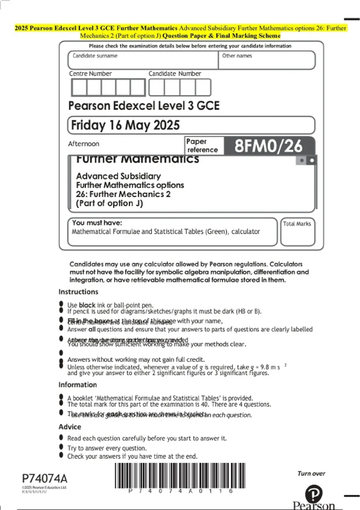 2025 pearson edexcel level 3 gce further mathemati