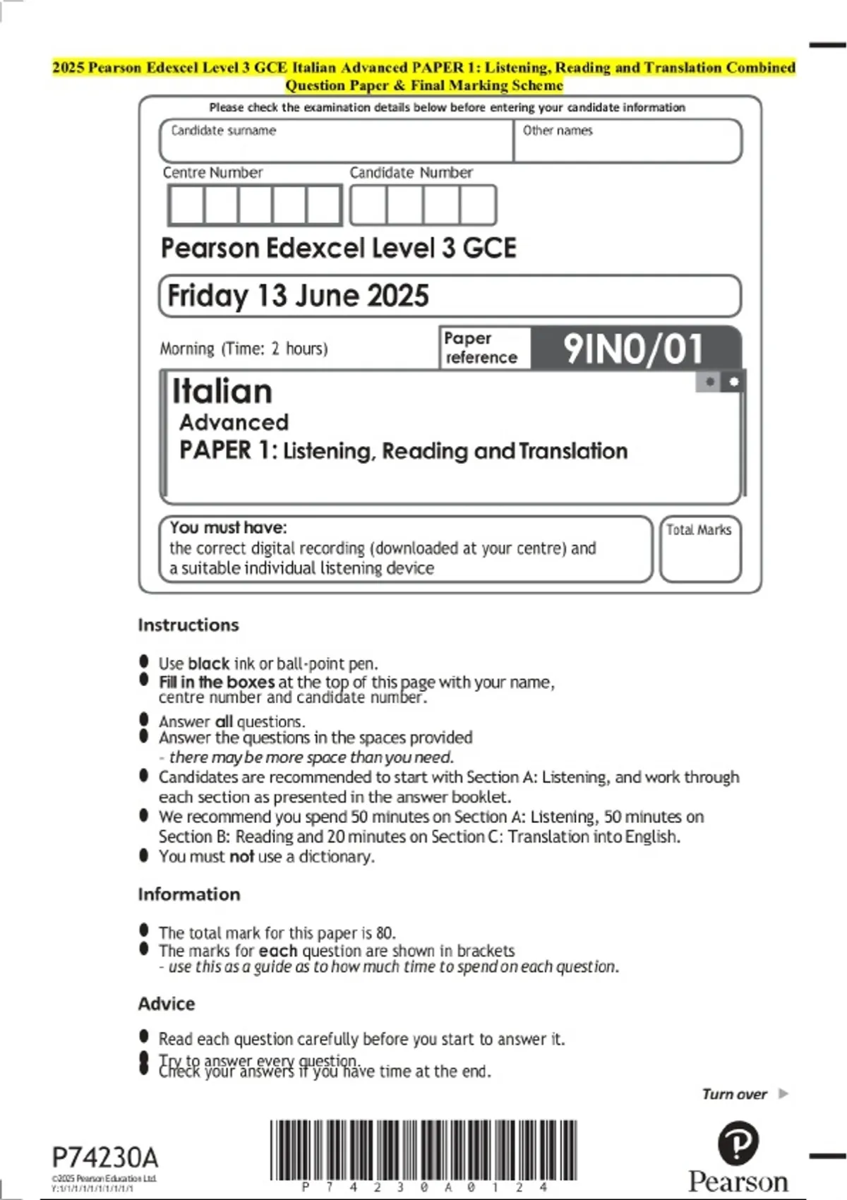 2025 Pearson Edexcel Level 3 GCE Italian Advanced PAPER 1: Listening, Reading and Translation Examination Paper and Final Marking Scheme
