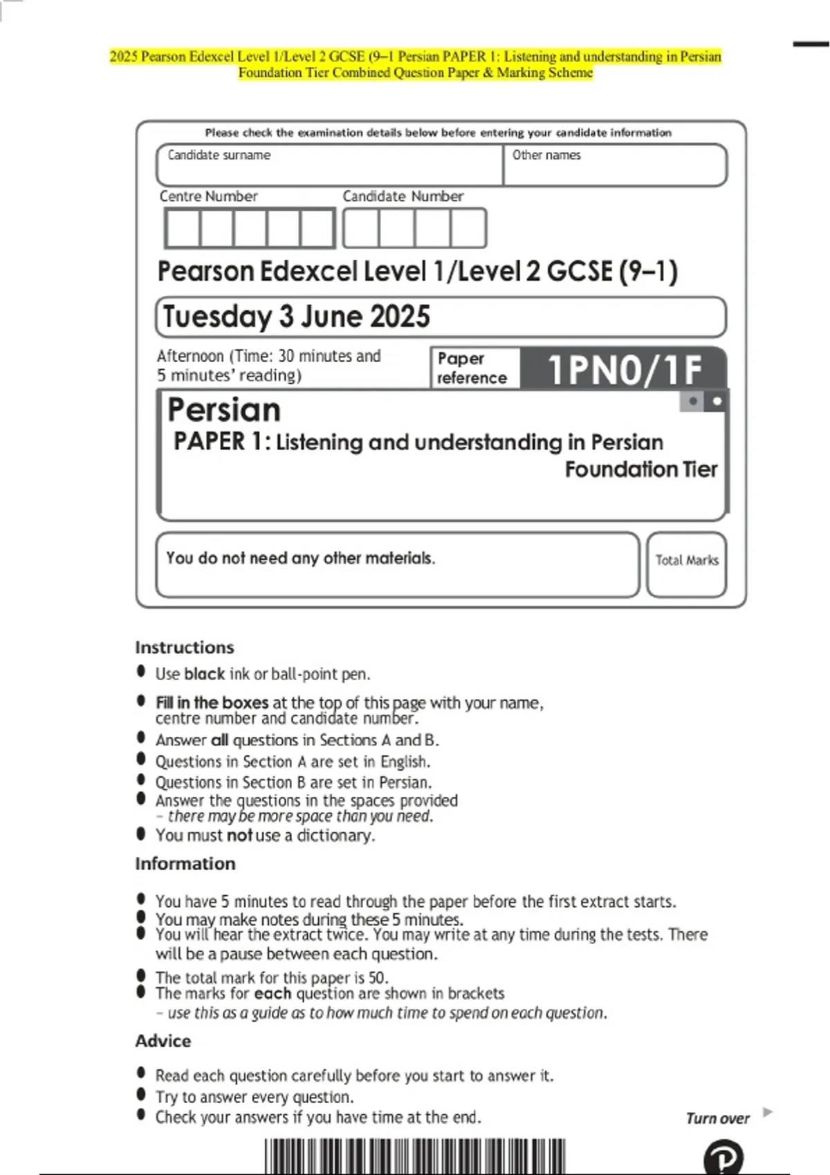 2025 Pearson Edexcel Level 1/Level 2 GCSE (9–1 Persian PAPER 1: Listening and understanding in Persian Foundation Tier Combined Question paper and approved marking scheme
