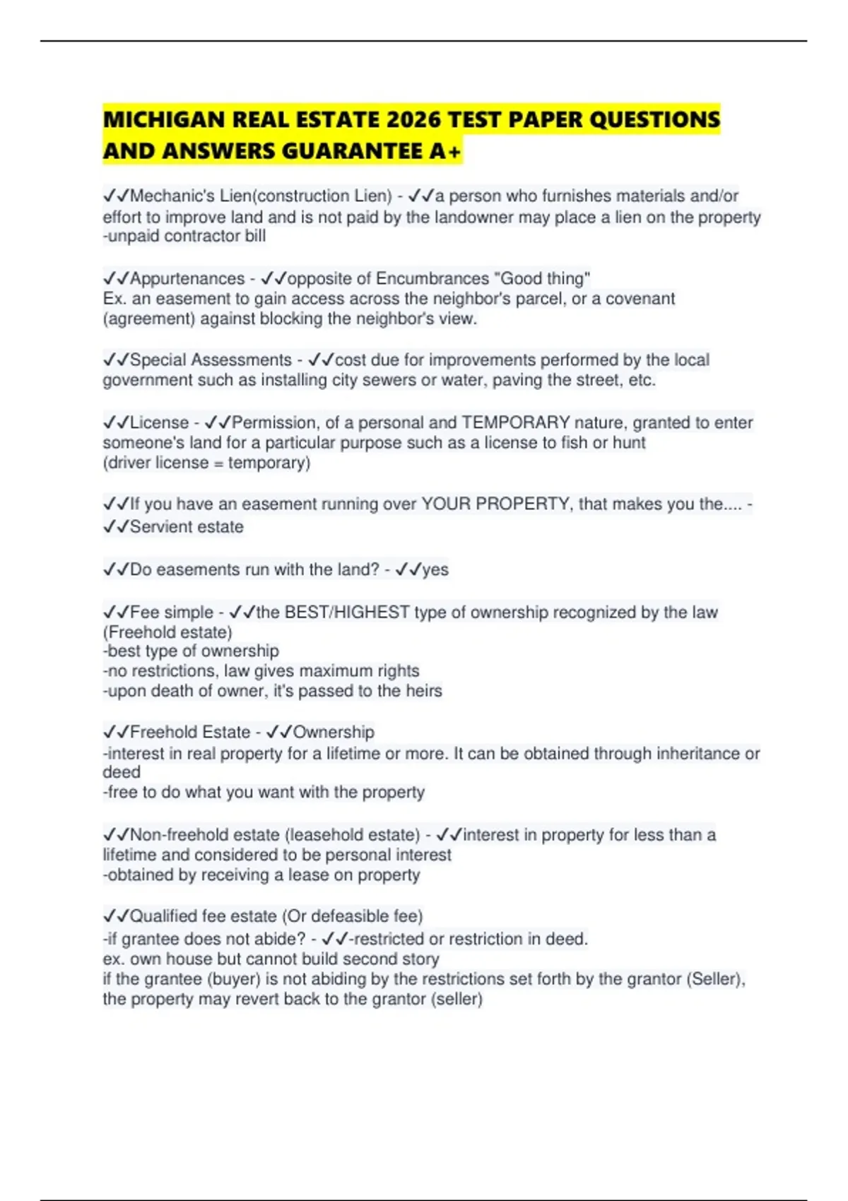 MICHIGAN REAL ESTATE 2026 TEST PAPER QUESTIONS AND ANSWERS GUARANTEE A+