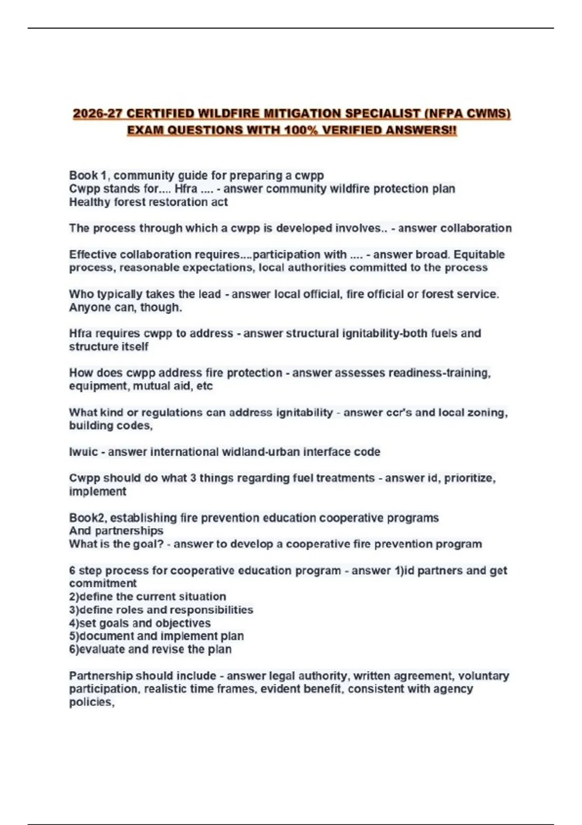 2026-27 CERTIFIED WILDFIRE MITIGATION SPECIALIST (NFPA CWMS) EXAM QUESTIONS WITH 100% VERIFIED ANSWERS!!...