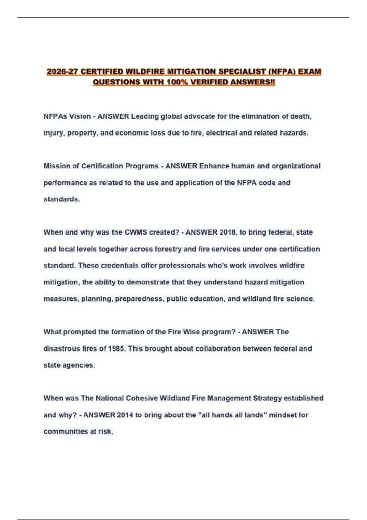 2026-27 CERTIFIED WILDFIRE MITIGATION SPECIALIST (NFPA) EXAM QUESTIONS WITH 100% VERIFIED ANSWERS!!...