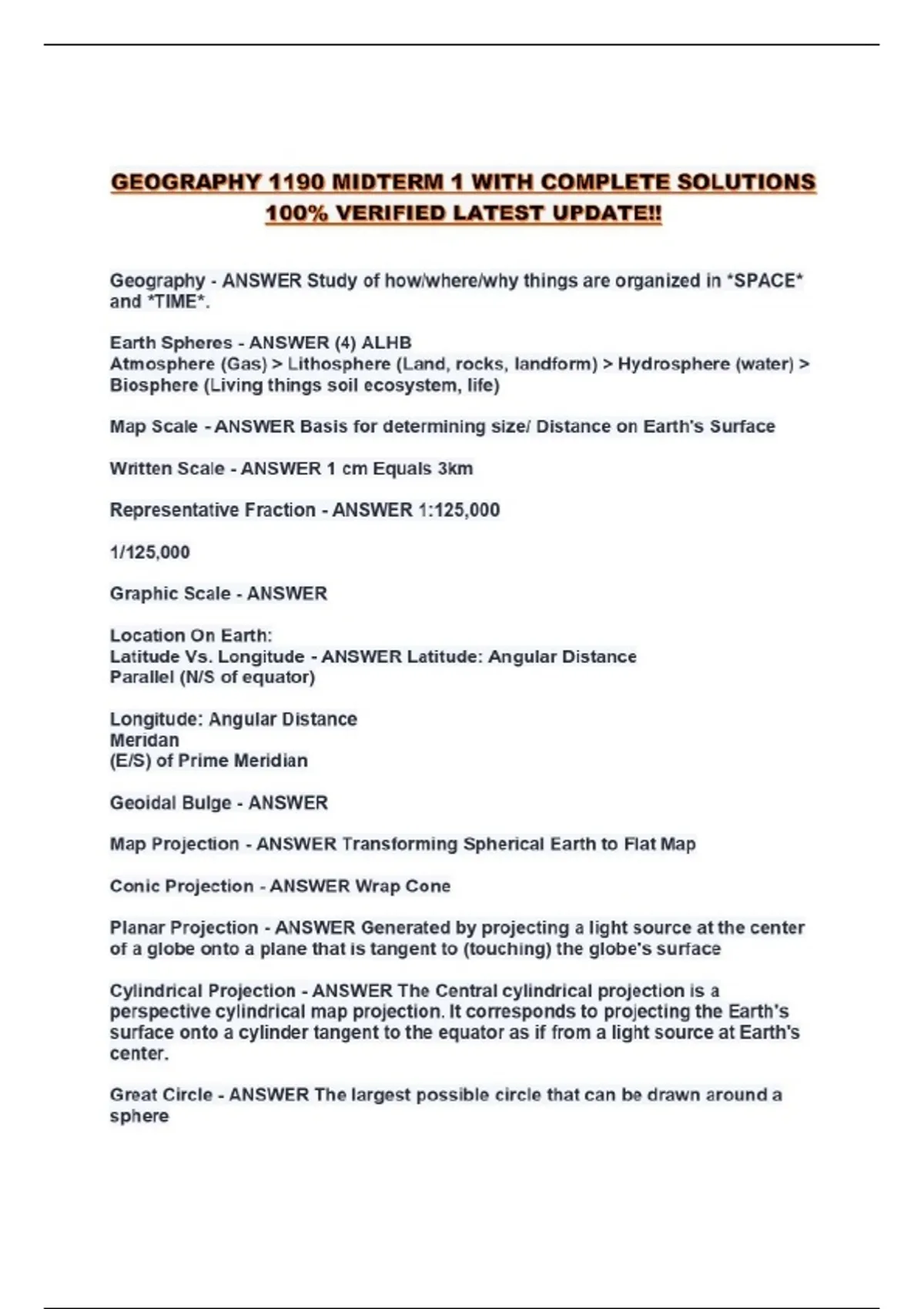 GEOGRAPHY 1190 MIDTERM 1 WITH COMPLETE SOLUTIONS 100% VERIFIED LATEST UPDATE!!...