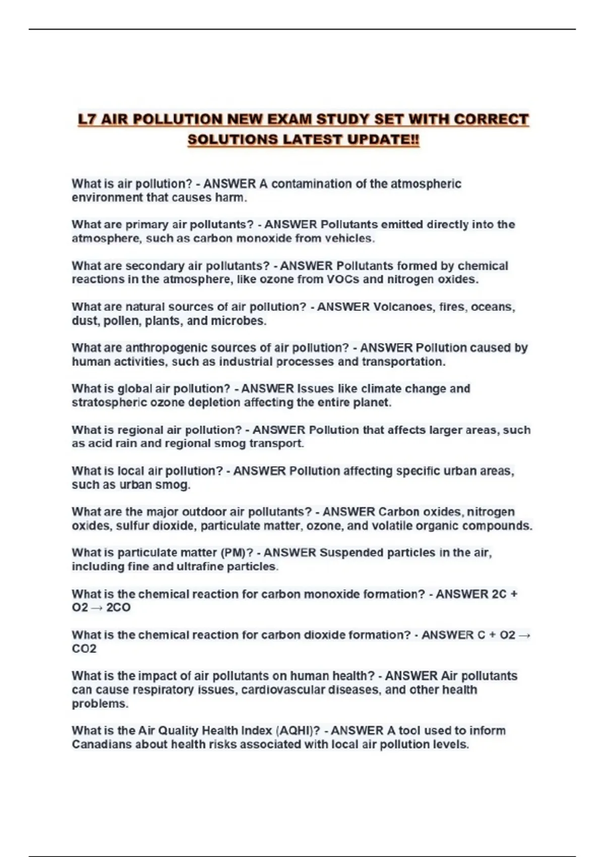 L7 AIR POLLUTION NEW EXAM STUDY SET WITH CORRECT SOLUTIONS LATEST UPDATE!!...