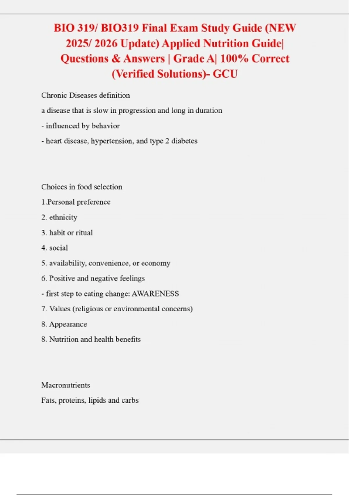 BIO 319/ BIO319 Final Exam Study Guide (NEW 2025/2026 Update) Applied Nutrition Guide| Questions & Answers | Grade A| 100% Correct (Verified Solutions)- GCU