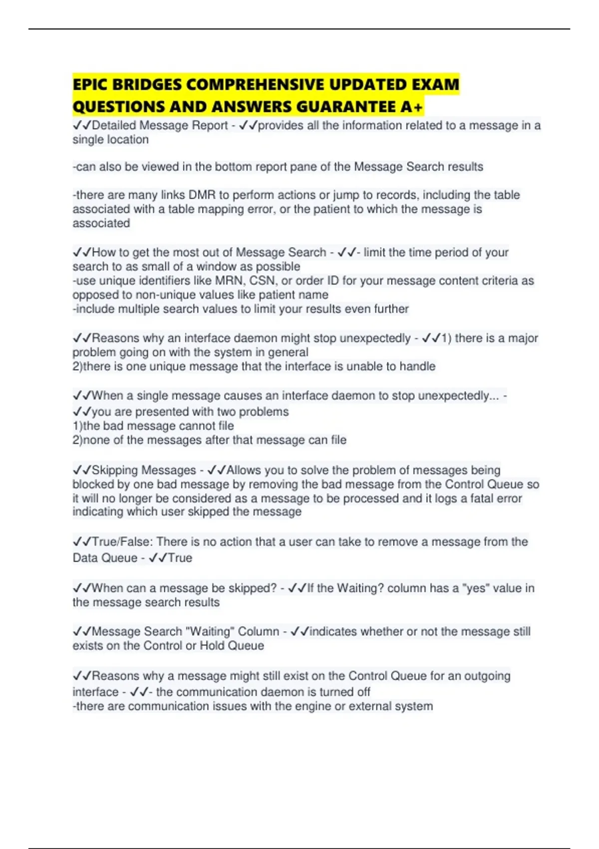 EPIC BRIDGES COMPREHENSIVE UPDATED EXAM QUESTIONS AND ANSWERS GUARANTEE A+