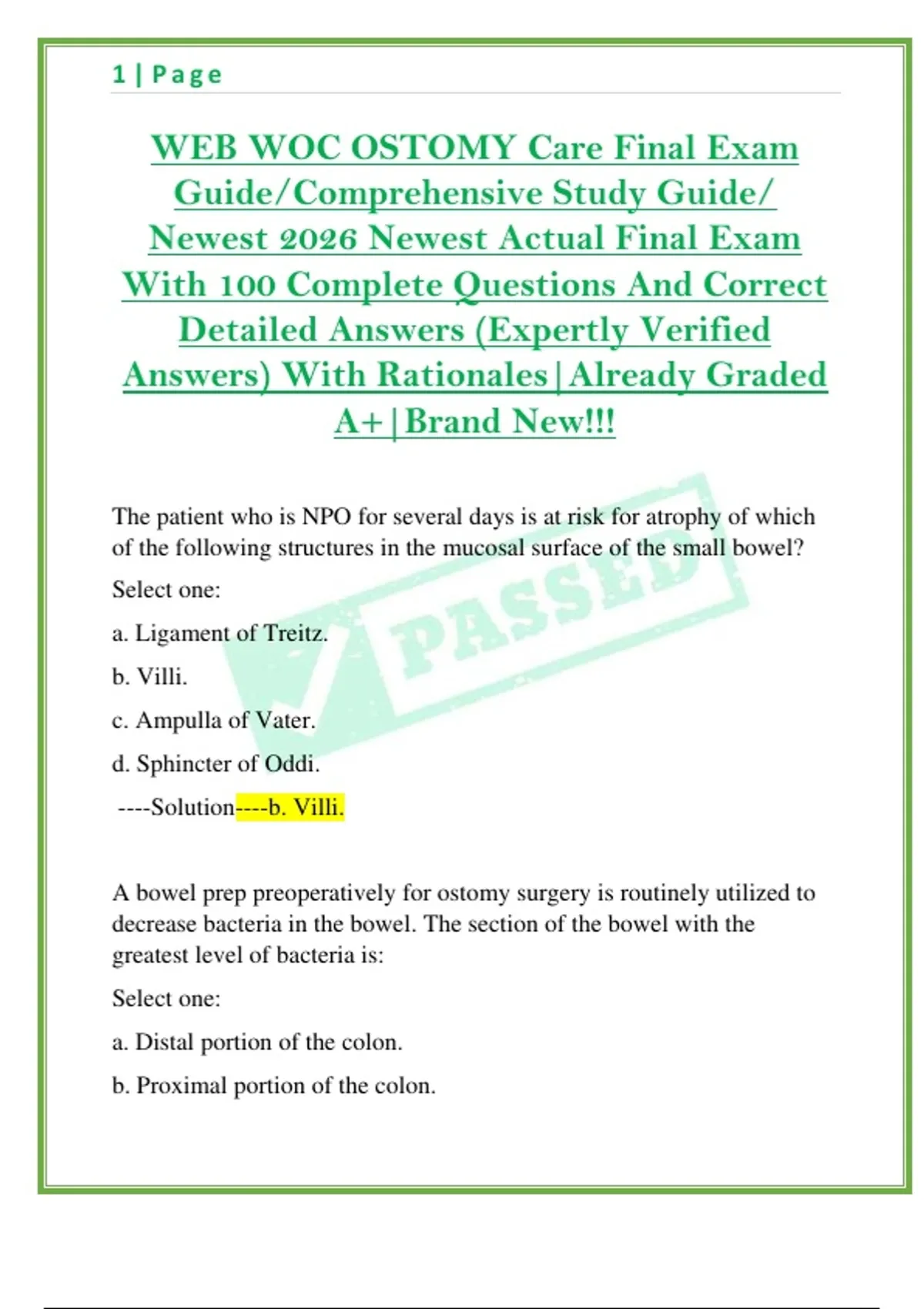 WEB WOC OSTOMY Care Final Exam Guide/Comprehensive Study Guide/ Newest 2026 Newest Actual Final Exam With 100 Complete Questions And Correct Detailed Answers (Expertly Verified Answers) With Rationales|Already Graded A+|Brand New!!!