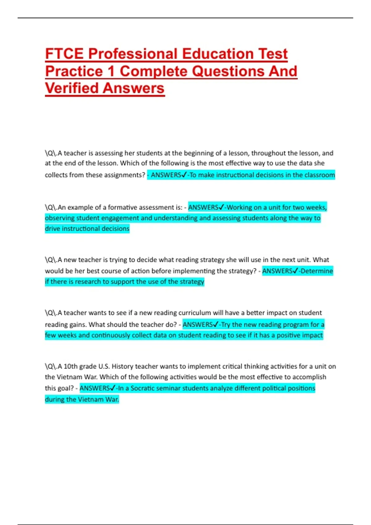 \Q\.An example of a formative assessment is: - ANSWERS✔-Working on a unit for two weeks,