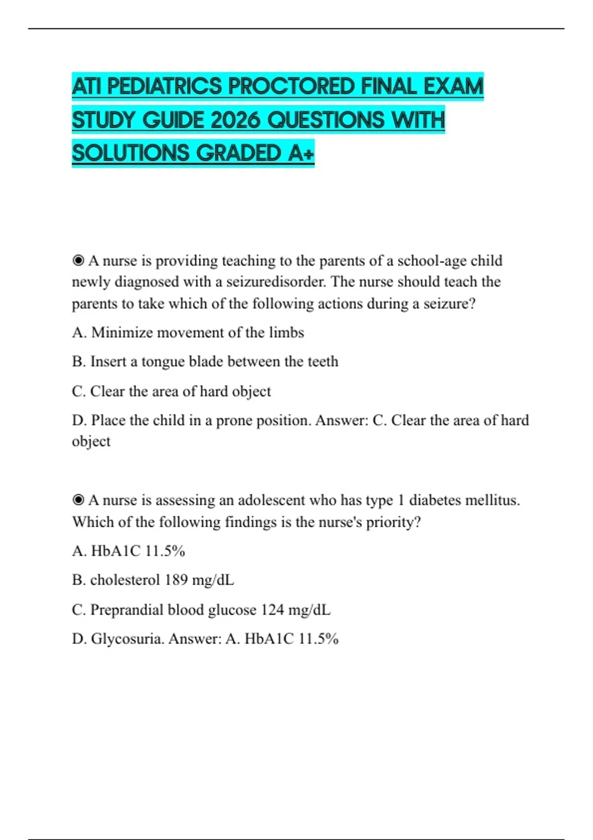 ATI PEDIATRICS PROCTORED FINAL EXAM STUDY GUIDE 2026 QUESTIONS WITH SOLUTIONS GRADED A+
