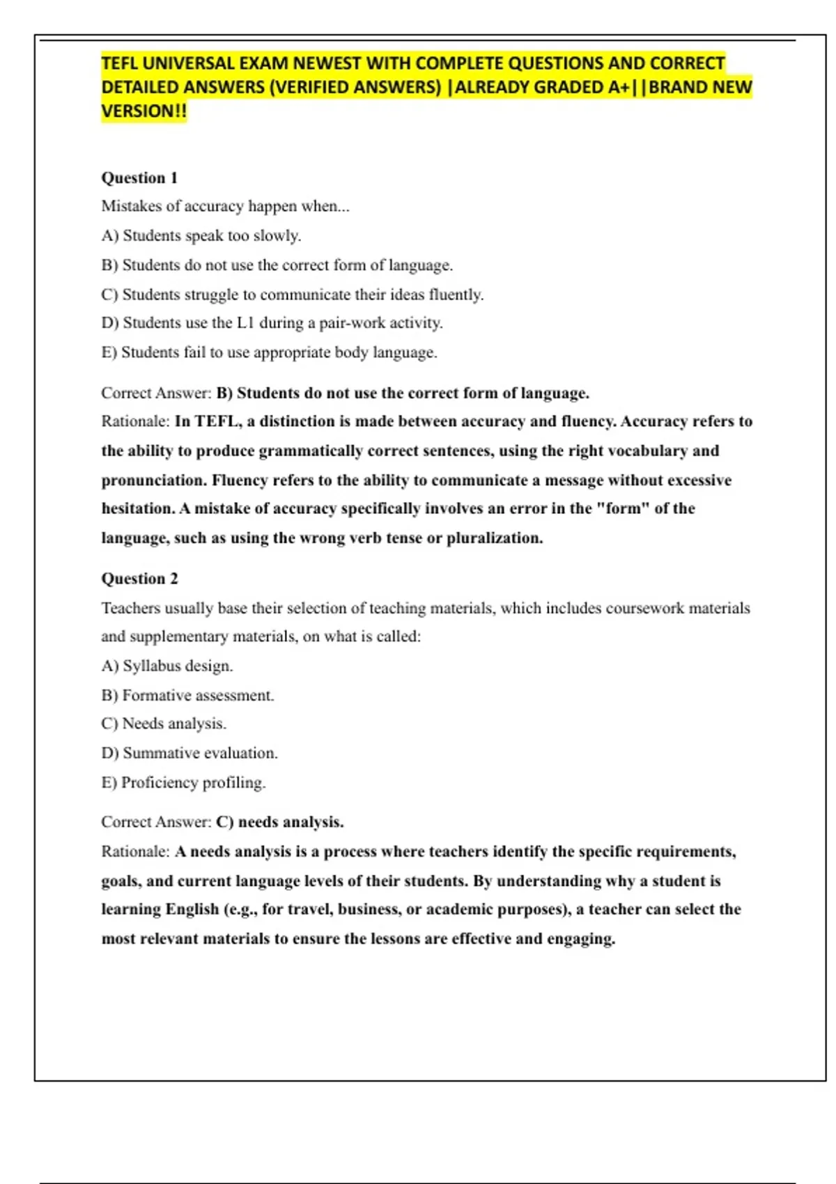 TEFL Universal Exam Newest With Complete Questions And Correct Detailed Answers (Verified Answers) |Already Graded A+||Brand New Version!!