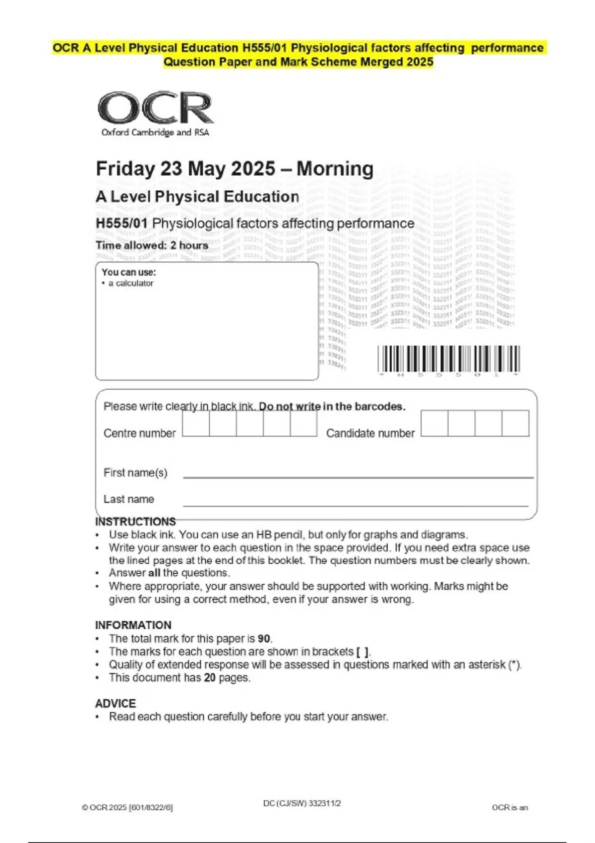OCR A Level Physical Education H555/01 Physiological factors affecting performance Question Paper and Mark Scheme Merged 2025