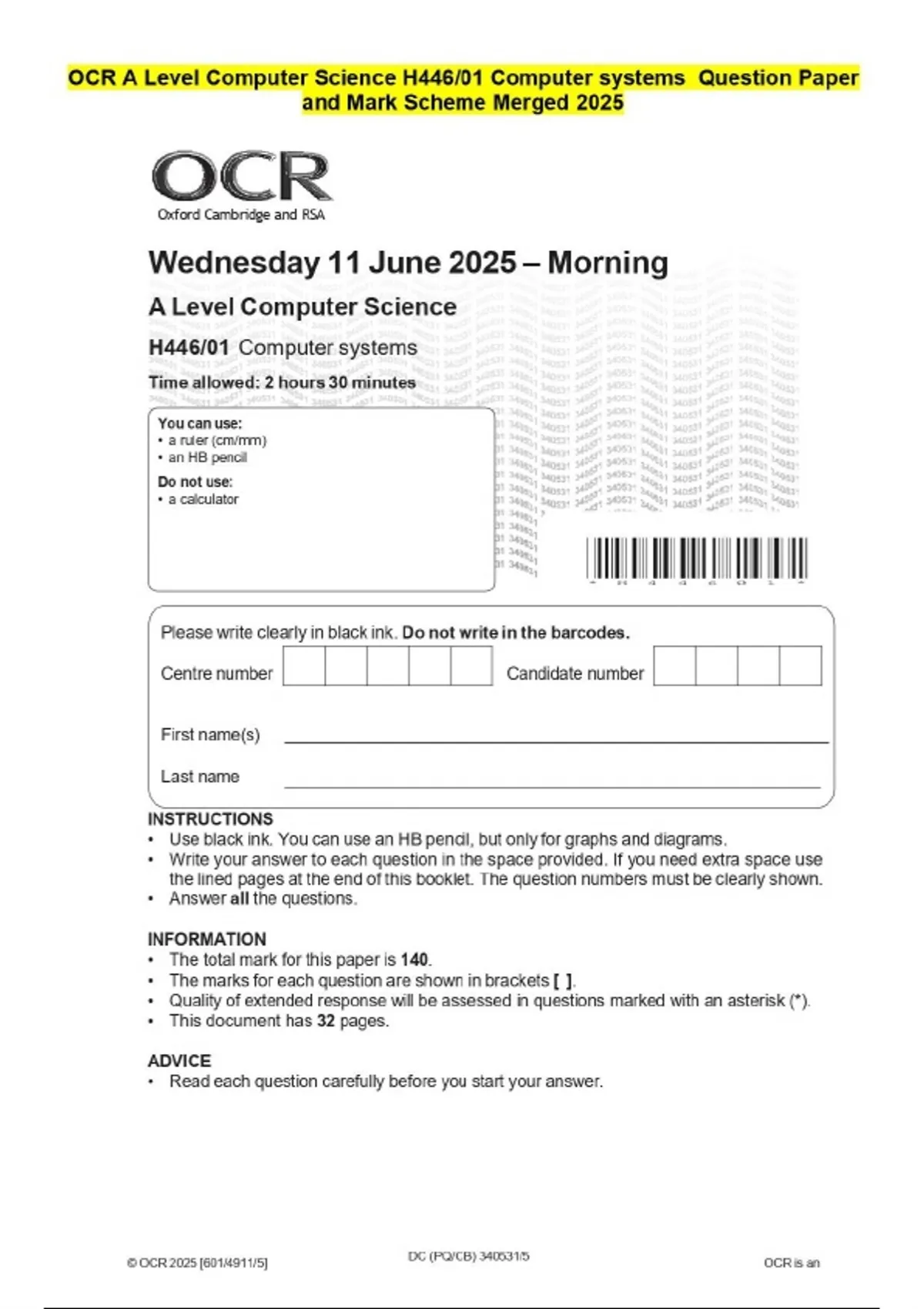 OCR A Level Computer Science H446/01 Computer systems Question Paper and Mark Scheme Merged 2025