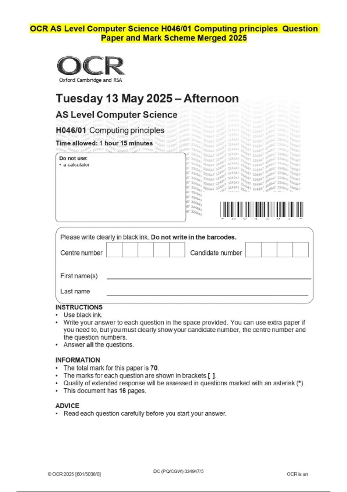 OCR AS Level Computer Science H046/01 Computing principles Question Paper and Mark Scheme Merged 2025
