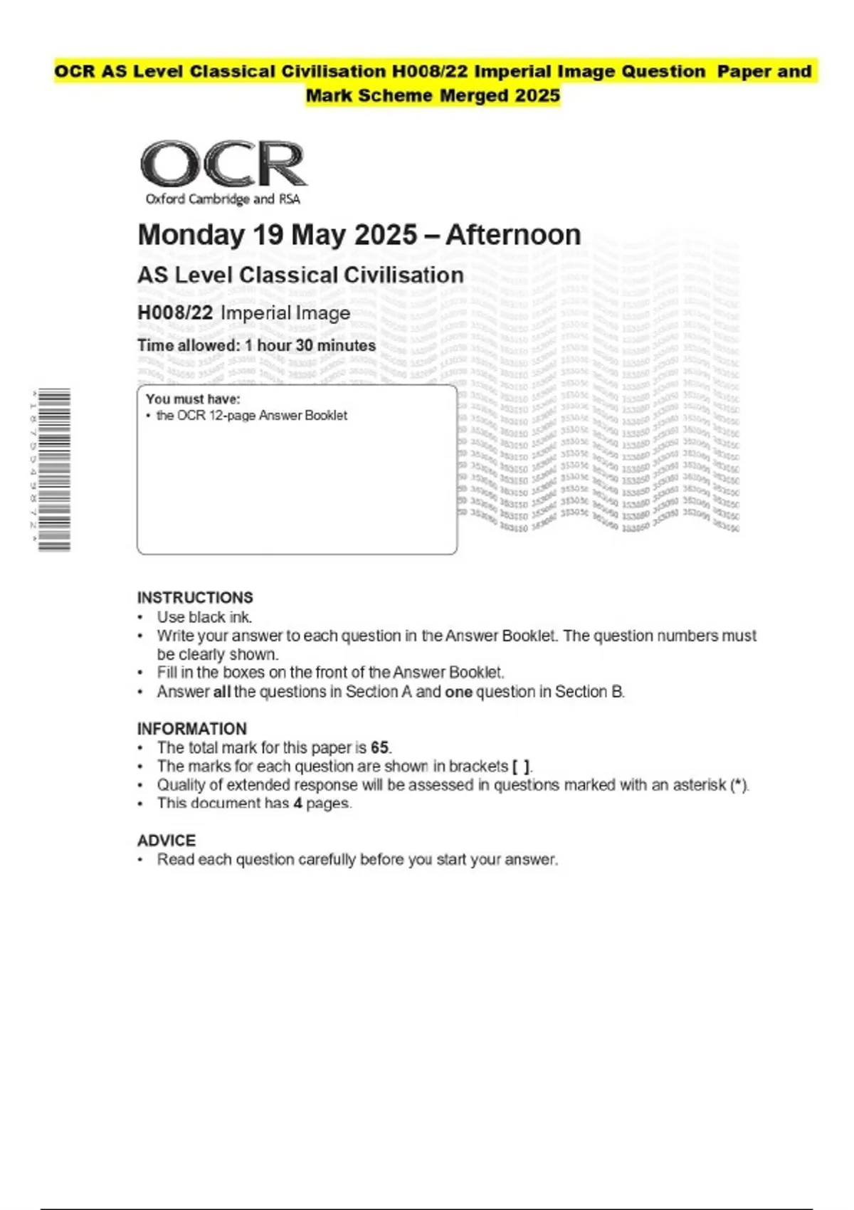 PACKAGE DEAL OCR AS Level Classical Civilisation Question Paper and Mark Scheme 2025