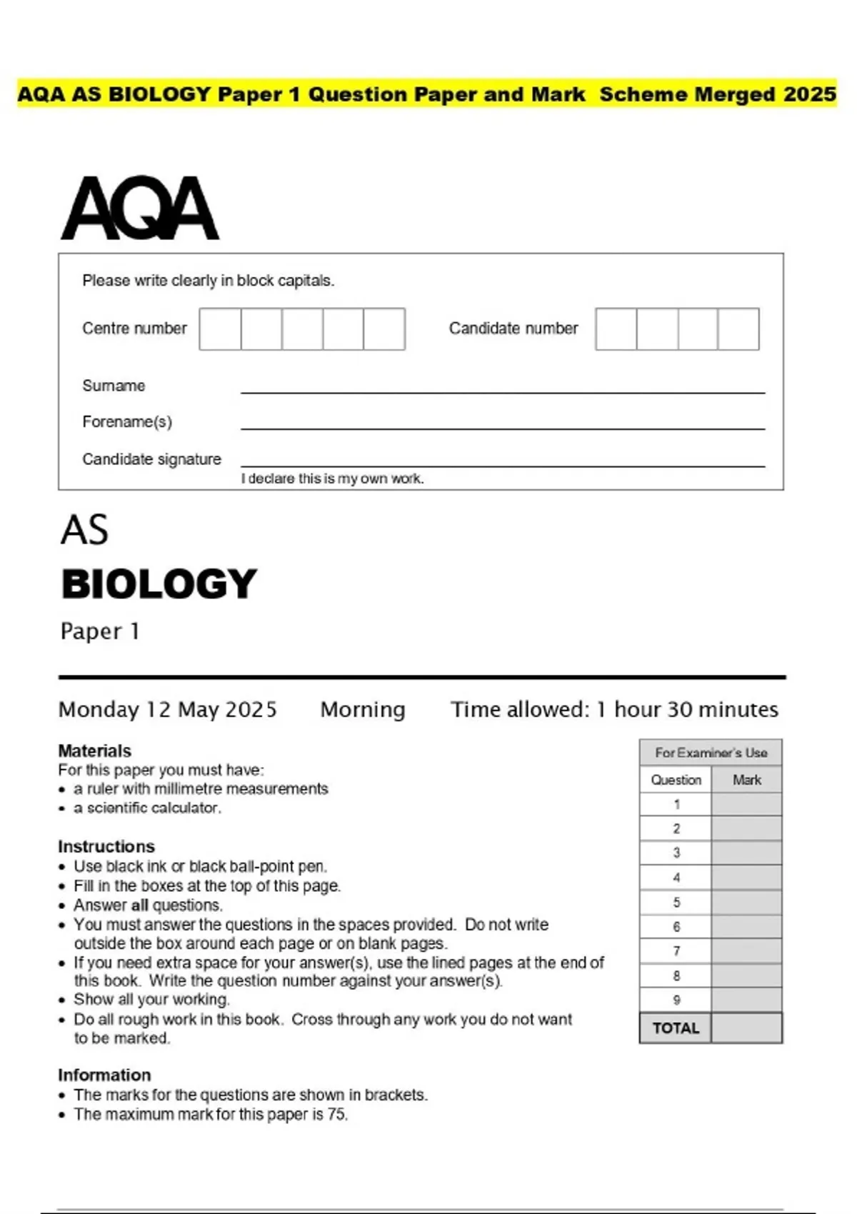 AQA AS BIOLOGY Paper 1 Question Paper and Mark Scheme Merged 2025