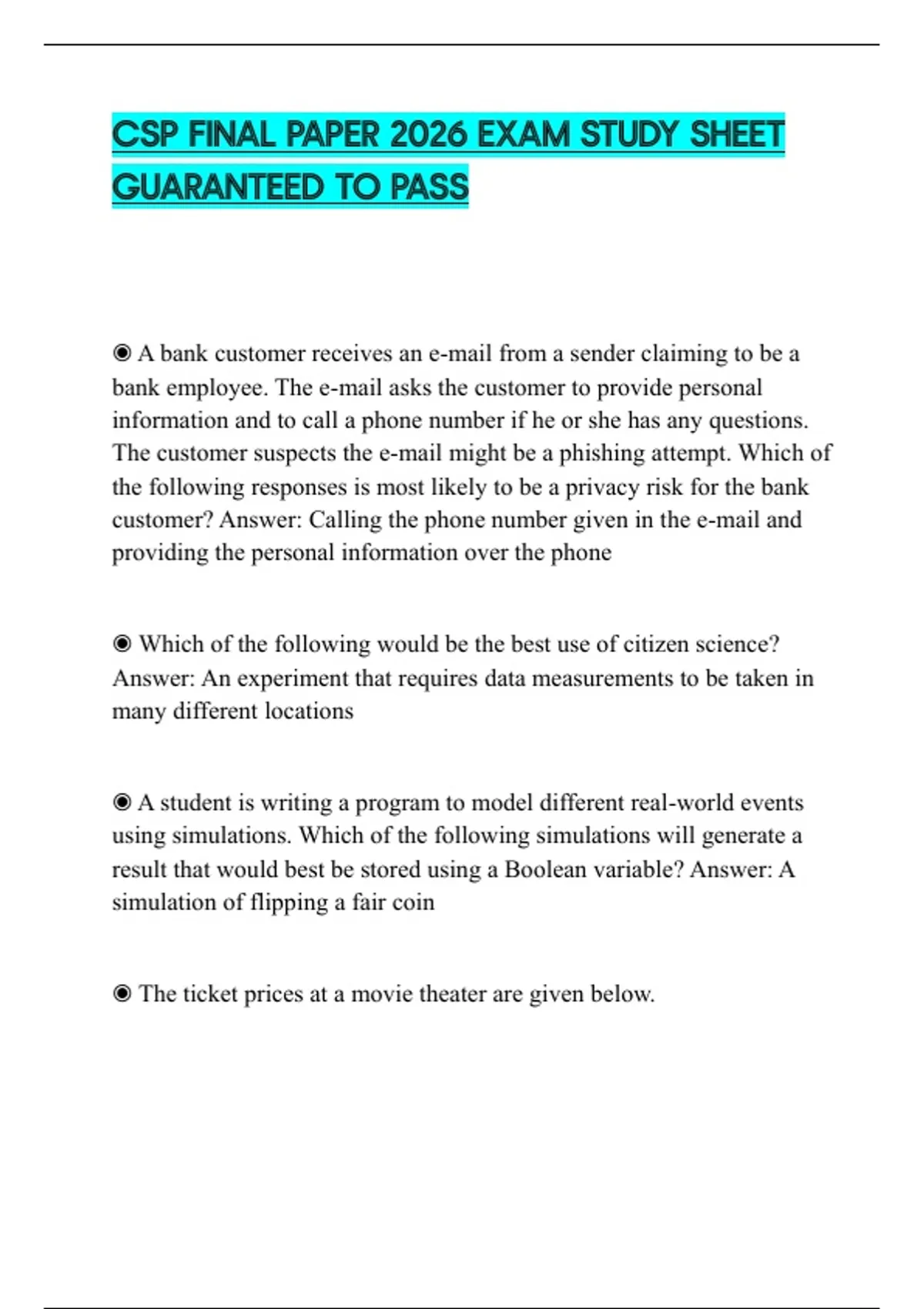CSP FINAL PAPER 2026 EXAM STUDY SHEET GUARANTEED TO PASS