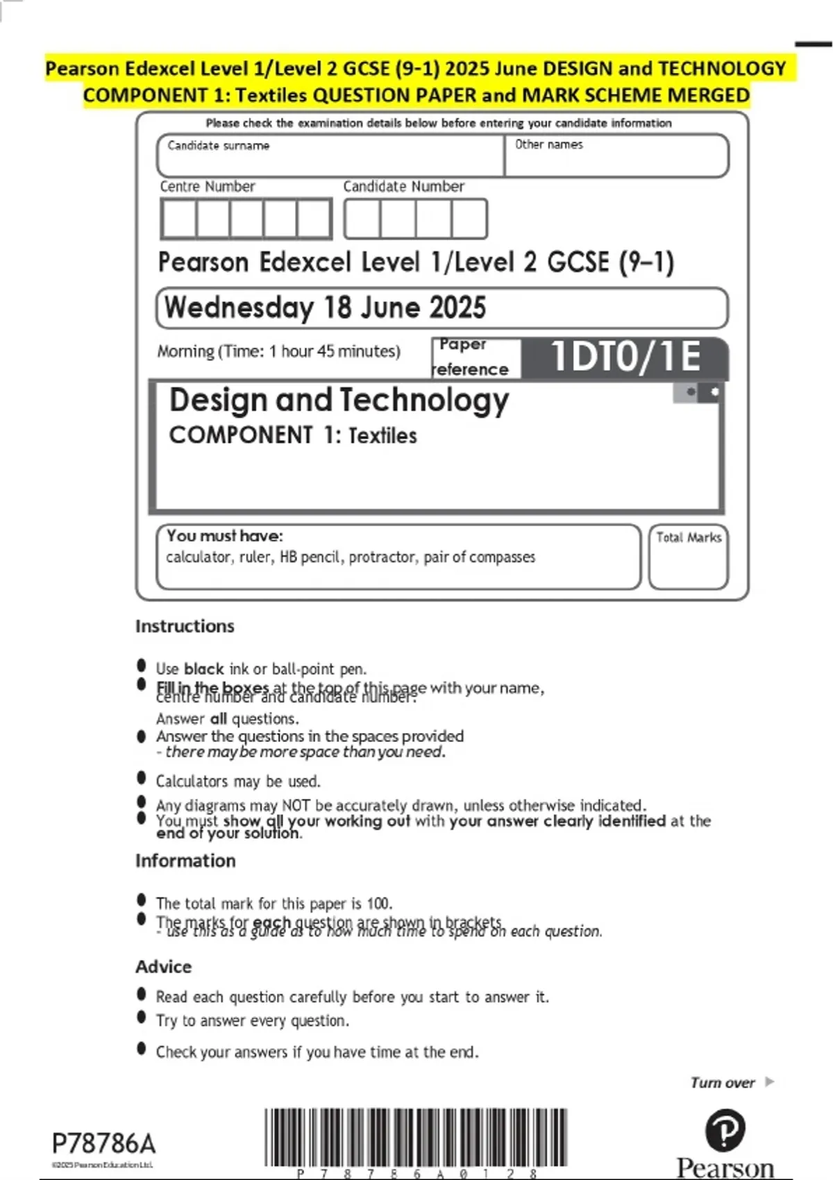 Pearson Edexcel Level 1/Level 2 GCSE (9-1) 2025 June DESIGN and TECHNOLOGY COMPONENT 1: Textiles QUESTION PAPER and MARK SCHEME MERGED
