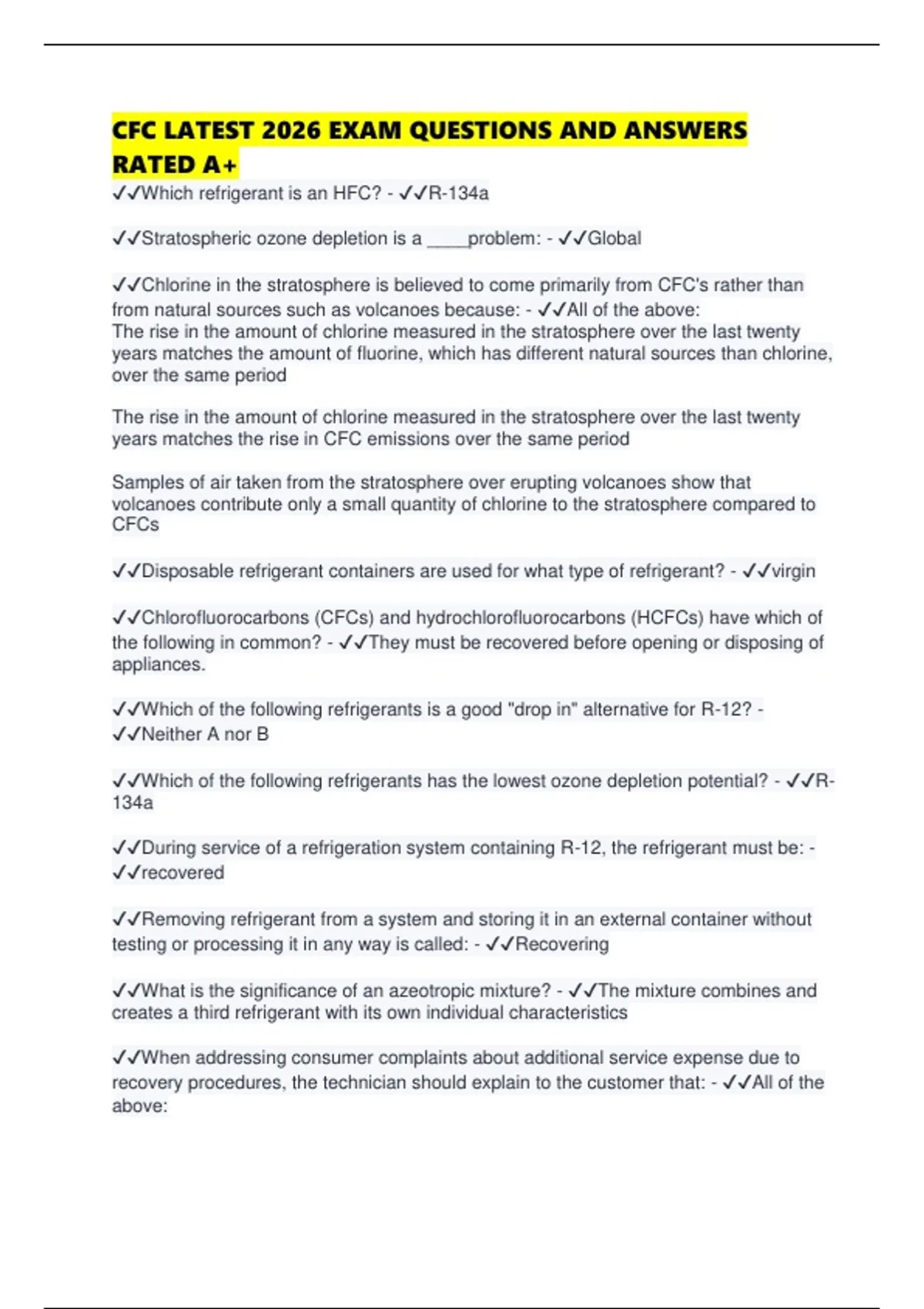 ✔✔Which of the following refrigerants has the lowest ozone depletion potential? - ✔✔R-