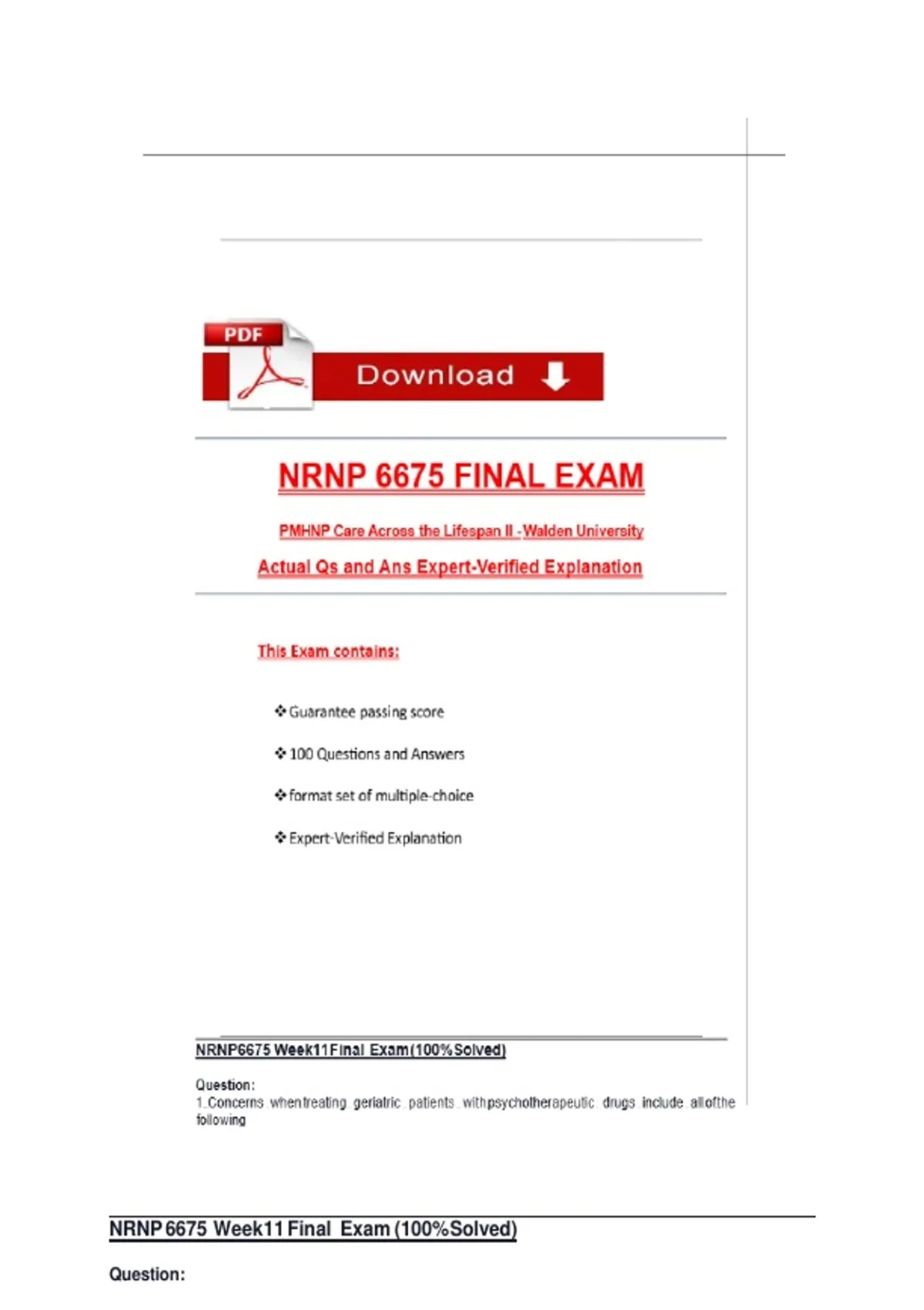 ****** INSTANT DOWNLOAD PDF FILE **** NRNP 6675 Final Exam Qs and Ans with Explanation (Latest 2025 / 2026): Most Comprehensive to Pass the Exam, 100% Verified - UPDATED NRNP 6675 final exam questions and answers 2025, NRNP 6675 final exam practice test with rationale, NRNP 6675 exam prep guide latest 2026, advanced psychiatric mental health nursing final exam tips, comprehensive NRNP 6675 study guide for passing, NRNP 6675 final exam Q&A explanations step by step, Walden University NRNP 6675 course test prep 2025, best strategies to ace NRNP 6675 final exam, updated NRNP 6675 exam questions with explanations, NRNP 6675 most common topics and key concepts, proven techniques for NRNP 6675 final exam success, NRNP 6675 advanced practice questions and detailed answers, NRNP 6675 exam blueprint and high-yield review, NRNP 6675 mental health nursing course final guidelines, NRNP 6675 evidence-based practice questions and solutions, NRNP 6675 comprehensive exam review 2025 version, clinical scenario-based NRNP 6675 exam questions, expert-reviewed NRNP 6675 study tips and resources, NRNP 6675 in-depth final exam discussion board, step-by-step NRNP 6675 final exam explanation for each question NRNP 6675 week 6 midterm exam questions answers explanation latest , NRNP 6675 comprehensive midterm exam study guide, NRNP 6675 week 6 midterm preparation tips and strategies, advanced psychiatric mental health nurse practitioner midterm Q and A, NRNP 6675 updated exam blueprint and key concepts, how to pass NRNP 6675 midterm with detailed explanations, NRNP 6675 exam practice questions and in-depth answers, best resources for NRNP 6675 week 6 midterm success, most common NRNP 6675 psychiatric mental health exam topics, step-by-step solutions for NRNP 6675 midterm questions, NRNP 6675 high-yield review materials and practice tests, expert-reviewed NRNP 6675 week 6 exam question bank, evidence-based approaches for NRNP 6675 midterm exam, NRNP 6675 comprehensive Q and A guide for , latest NRNP 6675 course updates for advanced practice exam.