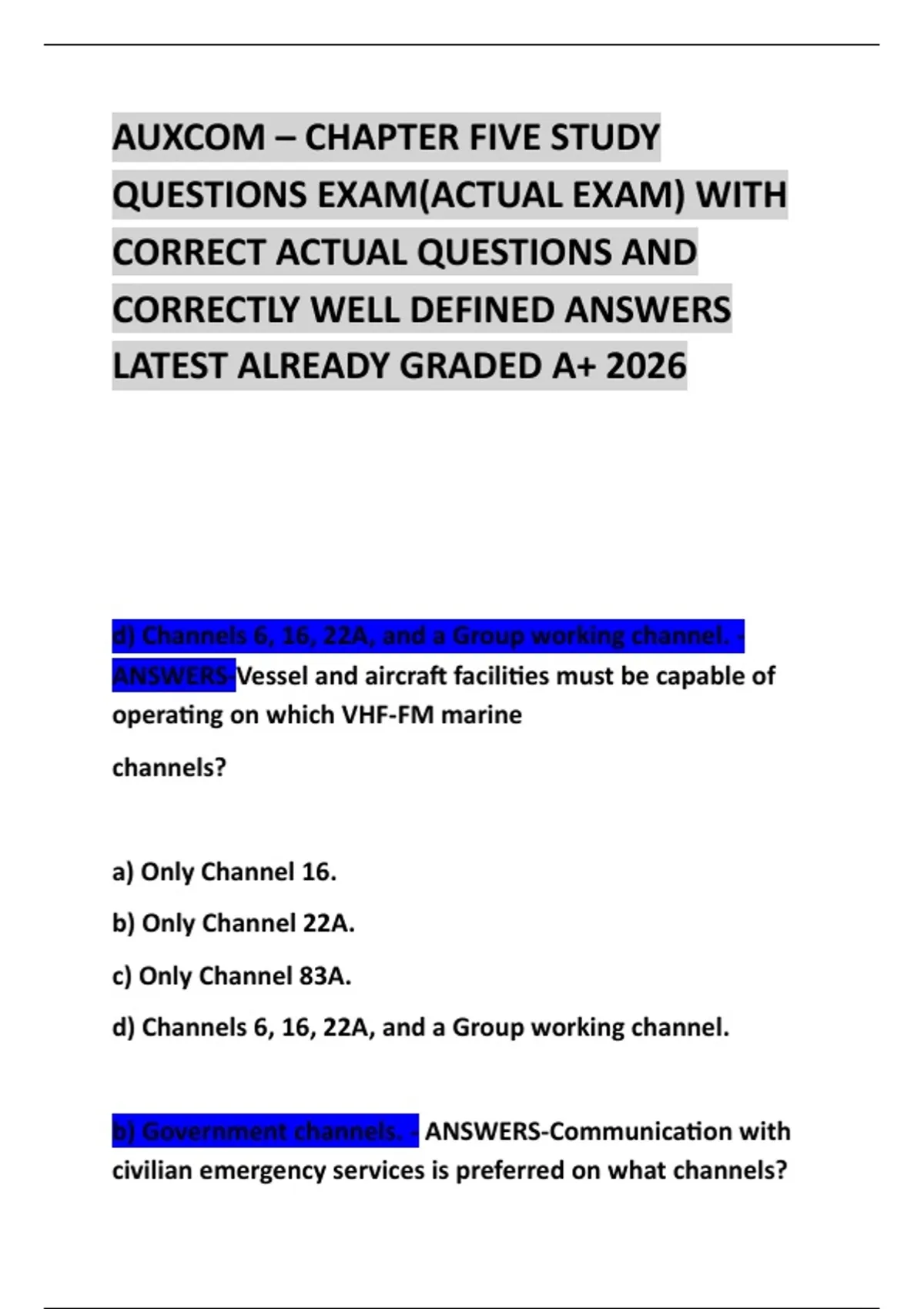 d) Channels 6, 16, 22A, and a Group working channel. -