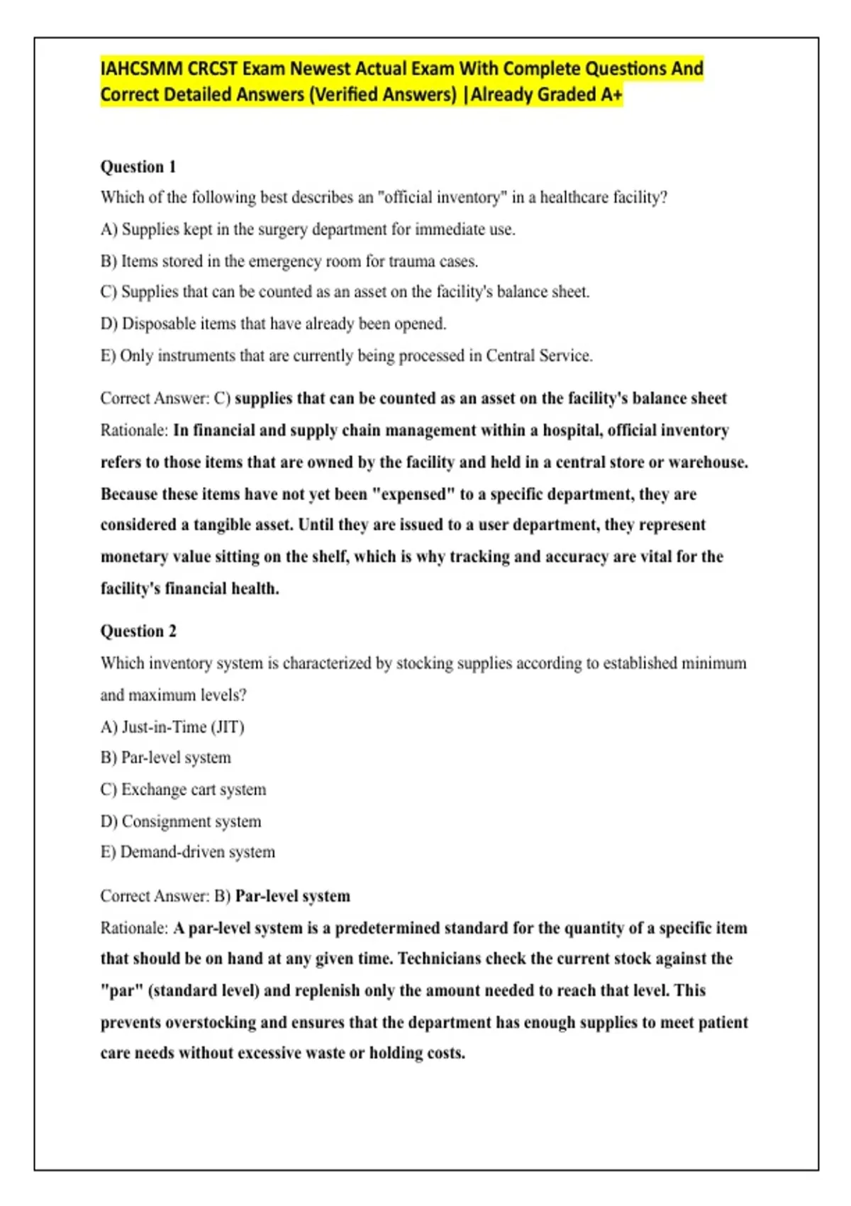 IAHCSMM CRCST Exam Newest Actual Exam With Complete Questions And