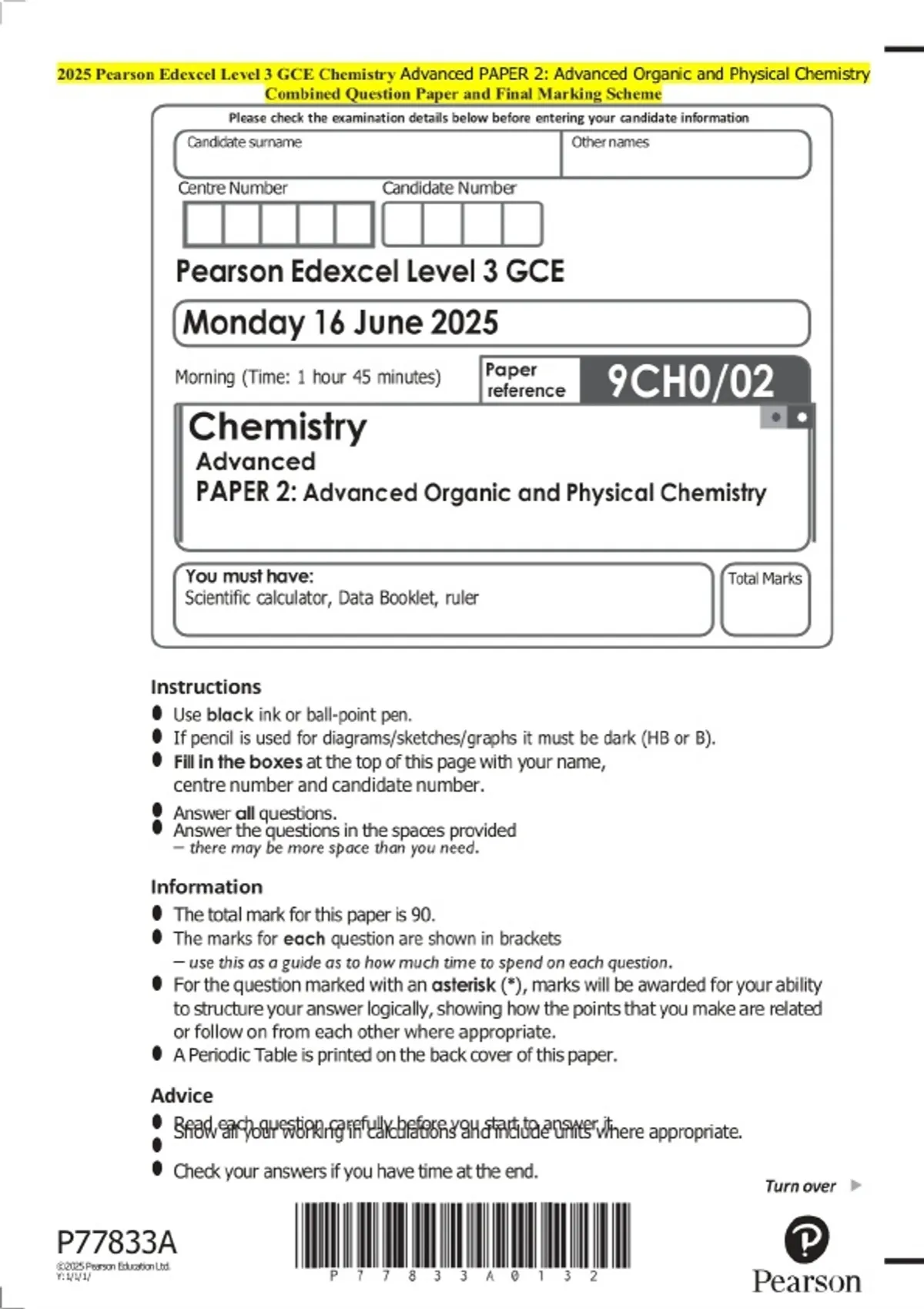 2025 Pearson Edexcel Level 3 GCE Chemistry Advanced PAPER 2: Advanced Organic and Physical Chemistry Question Paper with Final Marking Guide