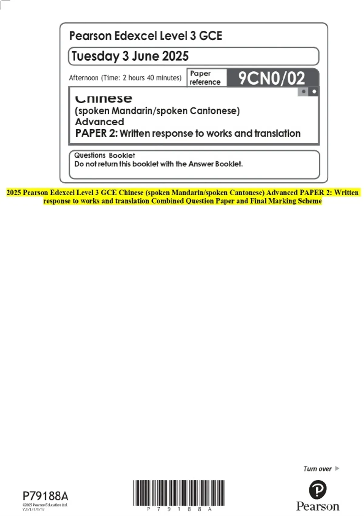 2025 Pearson Edexcel Level 3 GCE Chinese (spoken Mandarin/spoken Cantonese) Advanced PAPER 2: Written response to works and translation Question Paper with Final Marking Guide