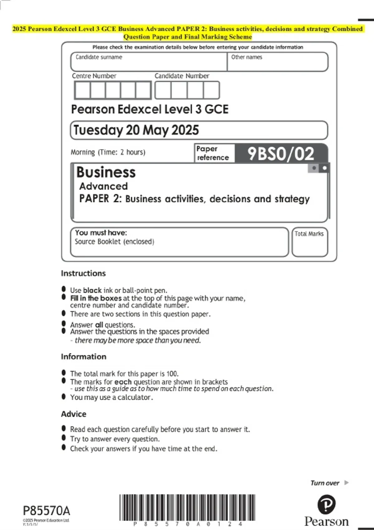 2025 Pearson Edexcel Level 3 GCE Business Advanced PAPER 2: Business activities, decisions and strategy Question Paper with Final Marking Guide
