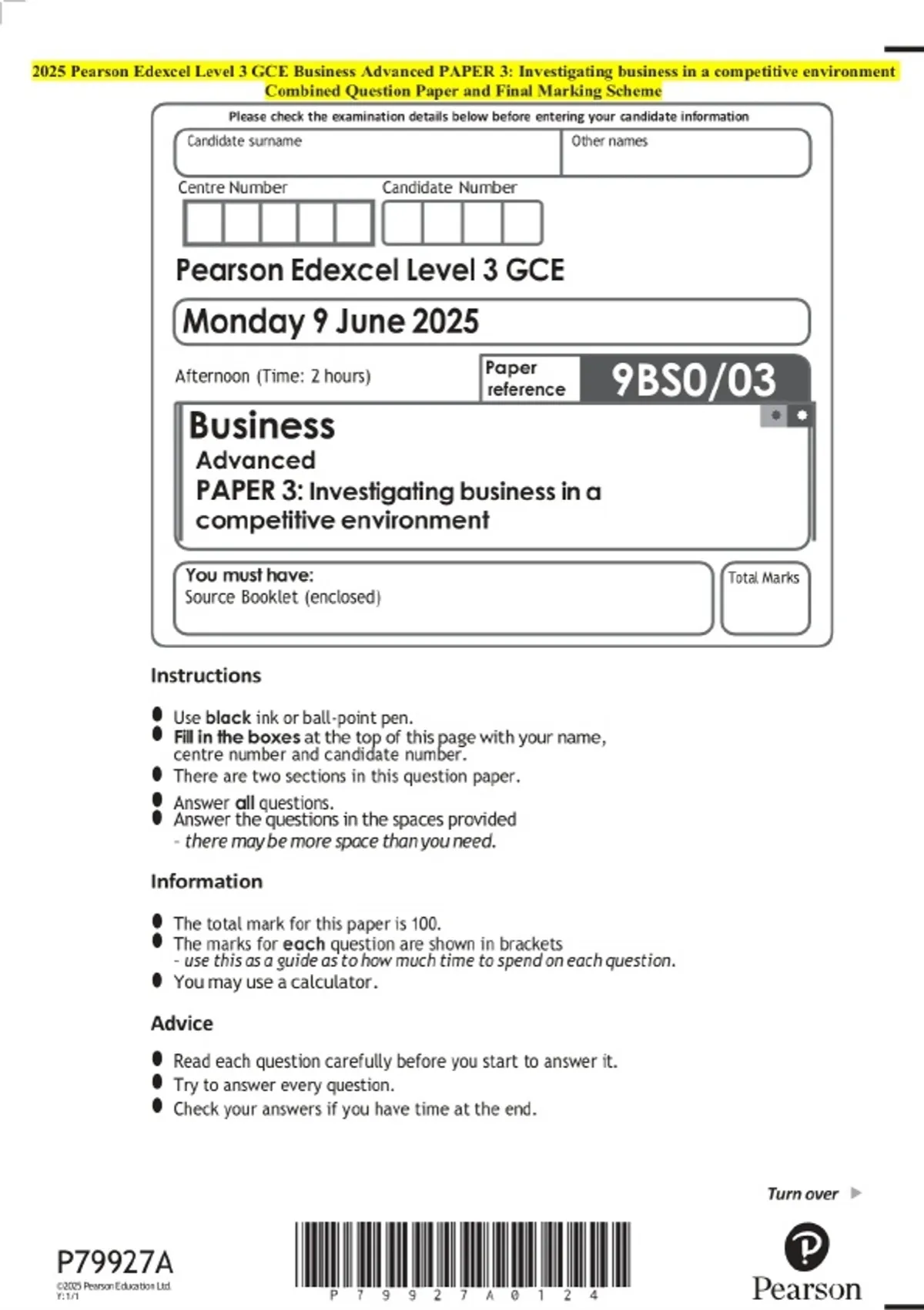 2025 Pearson Edexcel Level 3 GCE Business Advanced PAPER 3: Investigating business in a competitive environment Question Paper with Final Marking Guide