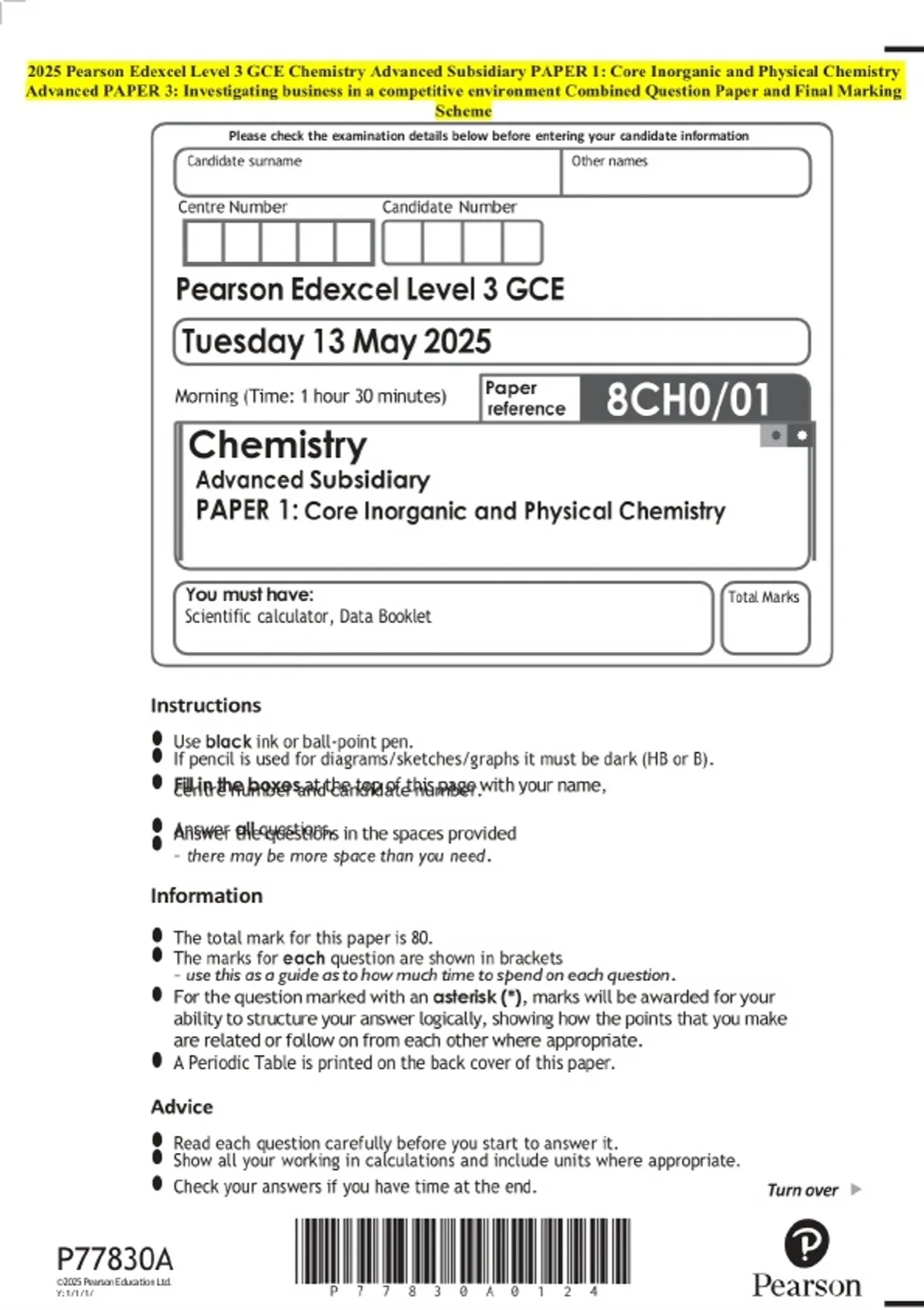 2025 Pearson Edexcel Level 3 GCE Chemistry Advanced Subsidiary PAPER 1: Core Inorganic and Physical Chemistry Advanced PAPER 3: Investigating business in a competitive environment Question Paper with Final Marking Guide