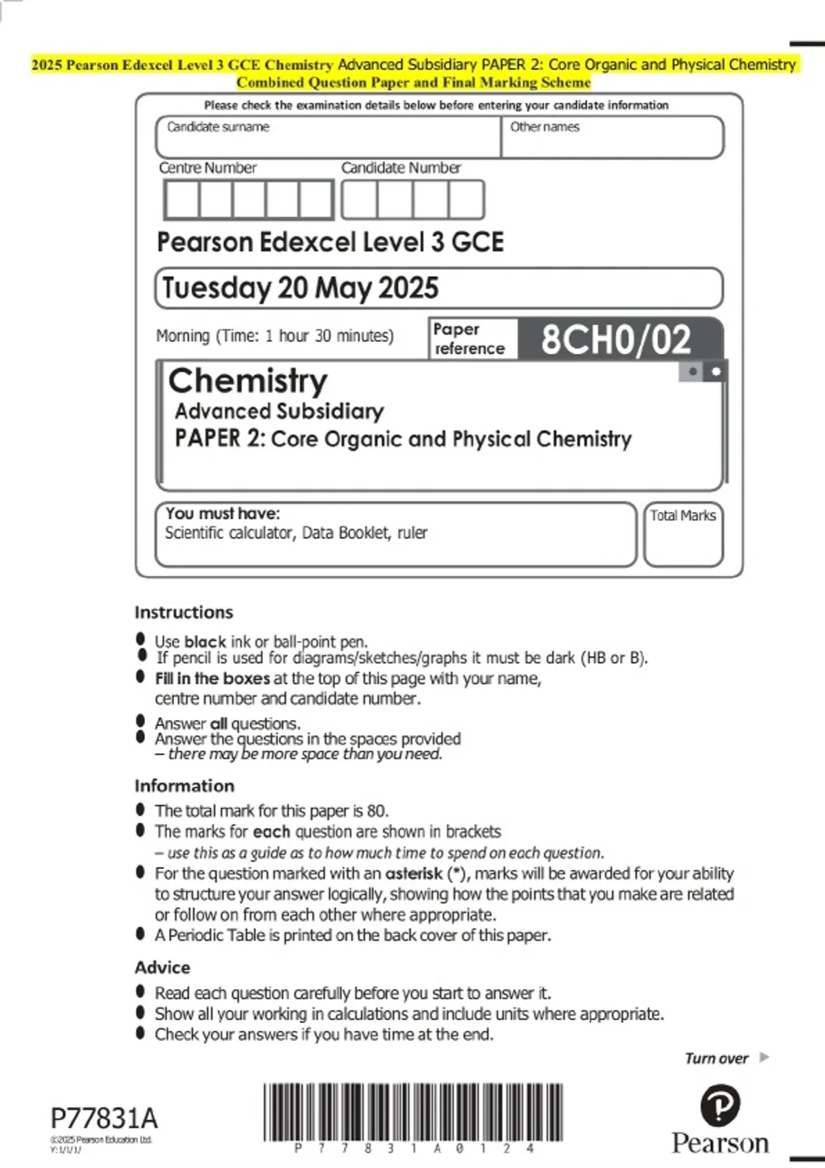 2025 Pearson Edexcel Level 3 GCE Chemistry Advanced Subsidiary PAPER 2: Core Organic and Physical Chemistry Question Paper with Final Marking Guide