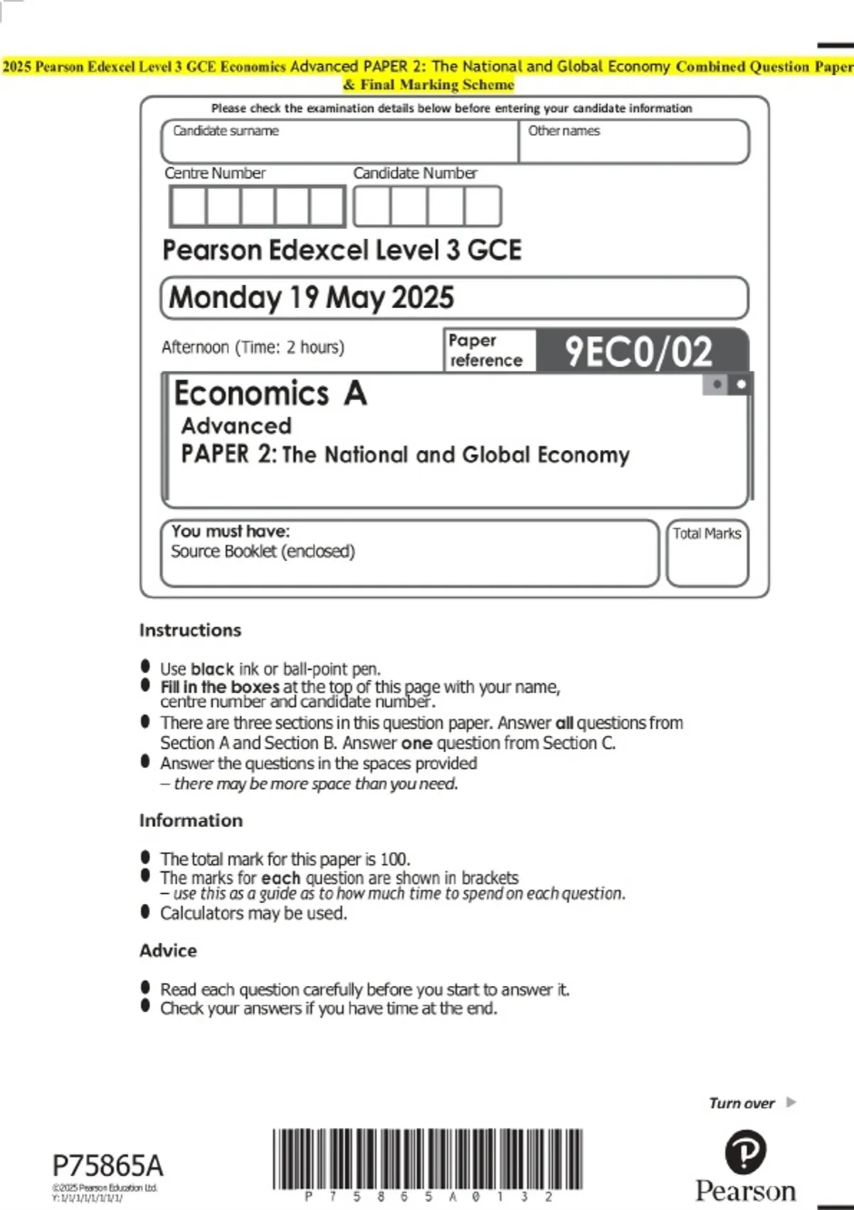 2025 Pearson Edexcel Level 3 GCE Economics Advanced PAPER 2: The National and Global Economy Question Paper with Final Marking Guide