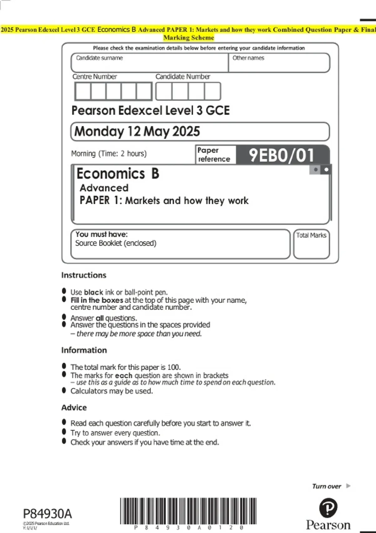 2025 Pearson Edexcel Level 3 GCE Economics B Advanced PAPER 1: Markets and how they work Question Paper with Final Marking Guide