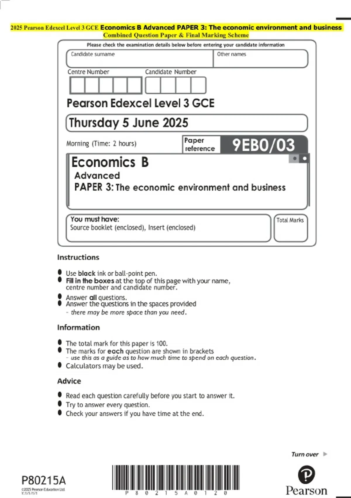 2025 Pearson Edexcel Level 3 GCE Economics B Advanced PAPER 3: The economic environment and business Question Paper with Final Marking Guide