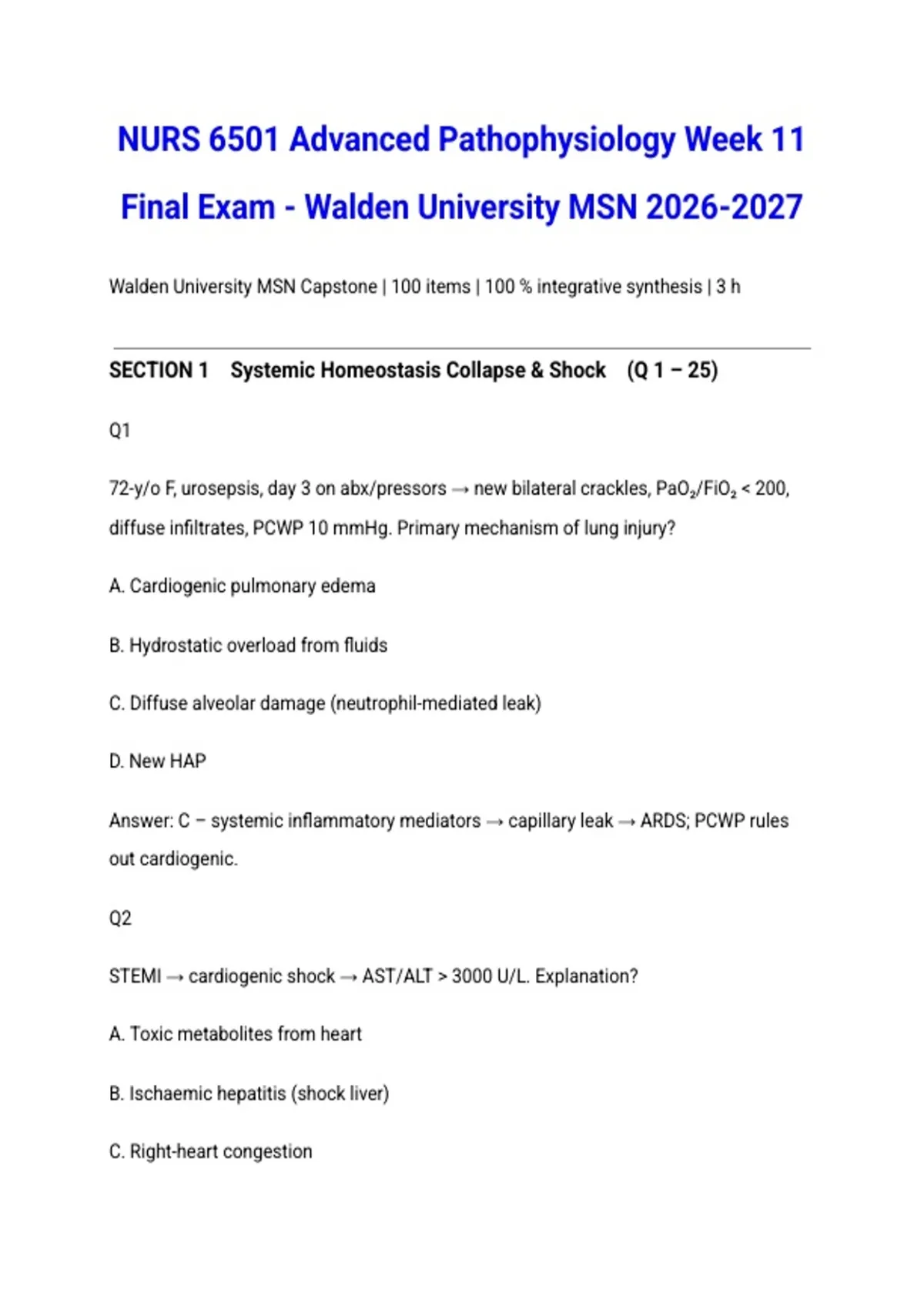Prepare for your NURS 6501 Advanced Pathophysiology Week 11 Final Exam with this comprehensive study guide designed specifically for Walden University's MSN program. This essential resource covers all exam topics including advanced disease mechanisms, systemic pathophysiology across body systems, genetic and molecular disorders, immune and inflammatory responses, and complex multi-system case studies. Aligned with Walden's curriculum, it provides the complete review needed to excel in your final assessment and advance in your MSN studies.