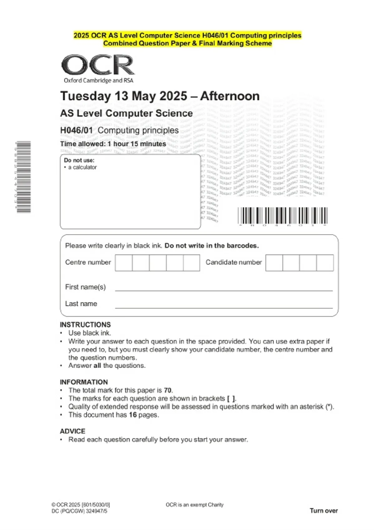 2025 OCR AS Level Computer Science H046/01 Computing principles Combined Exam paper along with marking scheme
